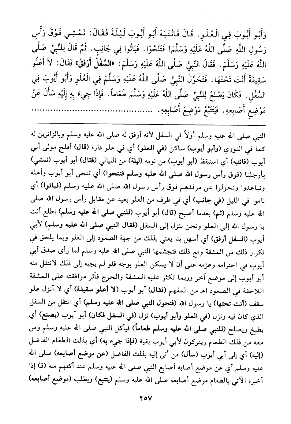 وَأَبُو أَيوبَ في الْعُلْو. قَال فَانْتَبَهَ أبُو أيوبَ لَيلَةً فَقَال: نَمْشِي فَوْقَ رأسِ رَسُولِ الله صلَّى الله عَلَيهِ وَسلَّمَ! فَتَنَحَّوْا. فَبَاتُوا في جَانِب. ثُمَّ قَال للنَّبيِّ صَلَّى الله عَلَيهِ وَسلمَ. فَقَال النبي صلى الله عَلَيهِ وَسلَّمَ: "السُّفْلُ أَرْفَقُ" فَقَال: لَا أعْلُو سَقِيفَةً أَنْتَ تَحْتَهَا. فَتَحَوَّلَ النبي صلى الله عَلَيهِ وَسلمَ في الْعُلْو وَأَبُو أيوبَ في السُّفْلِ. فَكَانَ يَصْنَعُ للنَّبيِّ صلى الله عَلَيهِ وَسلمَ طَعَامًا. فَإِذَا جِيءَ بِهِ إِلَيهِ سَأَلَ عَنْ مَوْضِعِ أَصَابِعِهِ. فَيَتَتَبَّعُ مَوْضِعَ أَصَابِعِهِ