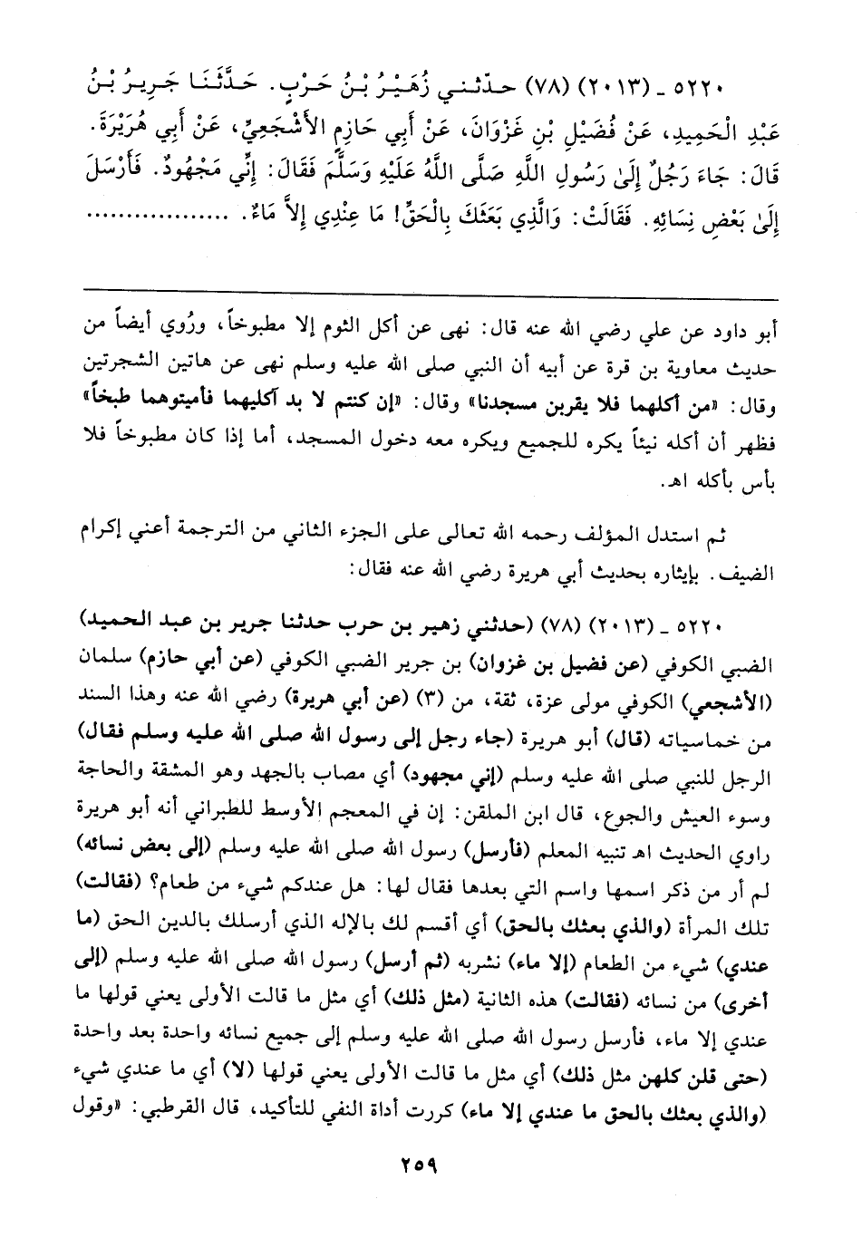 ٥٢٢٠ - (٢٠١٣) (٧٨) (حدثني زهير بن حرب حدثنا جرير بن عبد الحميد) الضبي الكوفي (عن فضيل بن غزوان) بن جرير الضبي الكوفي (عن أبي حازم) سلمان (الأشجعي) الكوفي مولى عزة، ثقة، من (٣) (عن أبي هريرة) رضي الله عنه وهذا السند من خماسياته (قال) أبو هريرة (جاء رجل إلى رسول الله صلى الله عليه وسلم فقال) الرجل للنبي صلى الله عليه وسلم (إني مجهود) أي مصاب بالجهد وهو المشقة والحاجة وسوء العيش والجوع، قال ابن الملقن: إن في المعجم الأوسط للطبراني أنه أبو هريرة راوي الحديث اهـ تنبيه المعلم (فأرسل) رسول الله صلى الله عليه وسلم (إلى بعض نسائه) لم أر من ذكر اسمها واسم التي بعدها فقال لها: هل عندكم شيء من طعام؟ (فقالت) تلك المرأة (والذي بعثك بالحق) أي أقسم لك بالإله الذي أرسلك بالدين الحق (ما عندي) شيء من الطعام (إلا ماء) نشربه (ثم أرسل) رسول الله صلى الله عليه وسلم (إلى أخرى) من نسائه (فقالت) هذه الثانية (مثل ذلك) أي مثل ما قالت الأولى يعني قولها ما عندي إلا ماء، فأرسل رسول الله صلى الله عليه وسلم إلى جميع نسائه واحدة بعد واحدة (حتى قلن كلهن مثل ذلك) أي مثل ما قالت الأولى يعني قولها (لا) أي ما عندي شيء (والذي بعثك بالحق ما عندي إلا ماء) كررت أداة النفي للتأكيد، قال القرطبي: "وقول