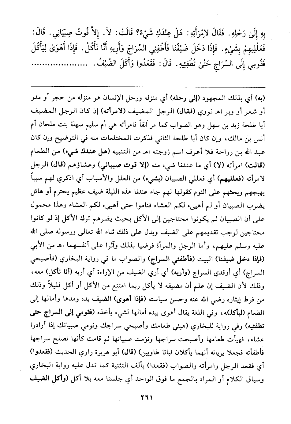 (به) أي بذلك المجهود (إلى رحله) أي منزله ورحل الإنسان هو منزله من حجر أو مدر أو شعر أو وبر اهـ نووي (فقال) الرجل المضيف (لامرأته) إن كان الرجل المضيف أبا طلحة زيد بن سهل وهو الصواب كما مر آنفًا فامرأته هي أم سليم سهلة بنت ملحان أم أنس بن مالك، وإن كان أبا طلحة الثاني فذكرت المختلعات منه في التوضيح وإن كان عبد الله بن رواحة فلا أعرف اسم زوجته اهـ من التنبيه (هل عندك شيء) من الطعام (قالت) امرأته (لا) أي ما عندنا شيء منه (إلا قوت صبياني) وعشاؤهم (قال) الرجل لامرأته (فعلليهم) أي فعللي الصبيان (بشيء) من العلل والأسباب أي اذكري لهم سببًا يهيجهم ويحثهم على النوم كقولها لهم جاء عندنا هذه الليلة ضيف عظيم يحترم أو هائل يضرب الصبيان أو لم أهيئ لكم العشاء فناموا حتى أهيئ لكم العشاء وهذا محمول على أن الصبيان لم يكونوا محتاجين إلى الأكل بحيث يضرهم ترك الأكل إذ لو كانوا محتاجين لوجب تقديمهم على الضيف ويدل على ذلك ثناء الله تعالى ورسوله صلى الله عليه وسلم عليهم، وأما الرجل والمرأة فرضيا بذلك وآثرا على أنفسهما اهـ من الأبي (فهذا دخل ضيفنا) البيت (فاطفئي السراج) والصواب ما في رواية البخاري (فأصبحي السراج) أي أوقدي السراج (وأريه) أي أري الضيف من الإراءة أي أريه (أنا نأكل) معه، وذلك لأن الضيف إن علم أن مضيفه لا يأكل ربما امتنع من الأكل أو أكل قليلًا وذلك من فرط إيثاره رضي الله عنه وحسن سياسته (فهذا أهوى) الضيف يده ومدها وأمالها إلى الطعام (ليأكلـ) ـه، وفي اللغة يقال أهوى بيده أمالها لشيء يأخذه (فقدمي إلى السراج حتى تطفئيه) وفي رواية للبخاري (هيئي طعامك وأصبحي سراجك ونومي صبيانك إذا أرادوا عشاء، فهيأت طعامها وأصبحت سراجها ونؤمت صبيانها ثم قامت كأنها تصلح سراجها فأطفأته فجعلا يريانه أنهما يأكلان فباتا طاويين) (قال) أبو هريرة راوي الحديث (فقعدوا) أي فقعد الرجل وامرأته والصواب (فقعدا) بألف التثنية كما تدل عليه رواية البخاري وسياق الكلام أو المراد بالجمع ما فوق الواحد أي جلسنا معه بلا أكل (وأكل الضيف