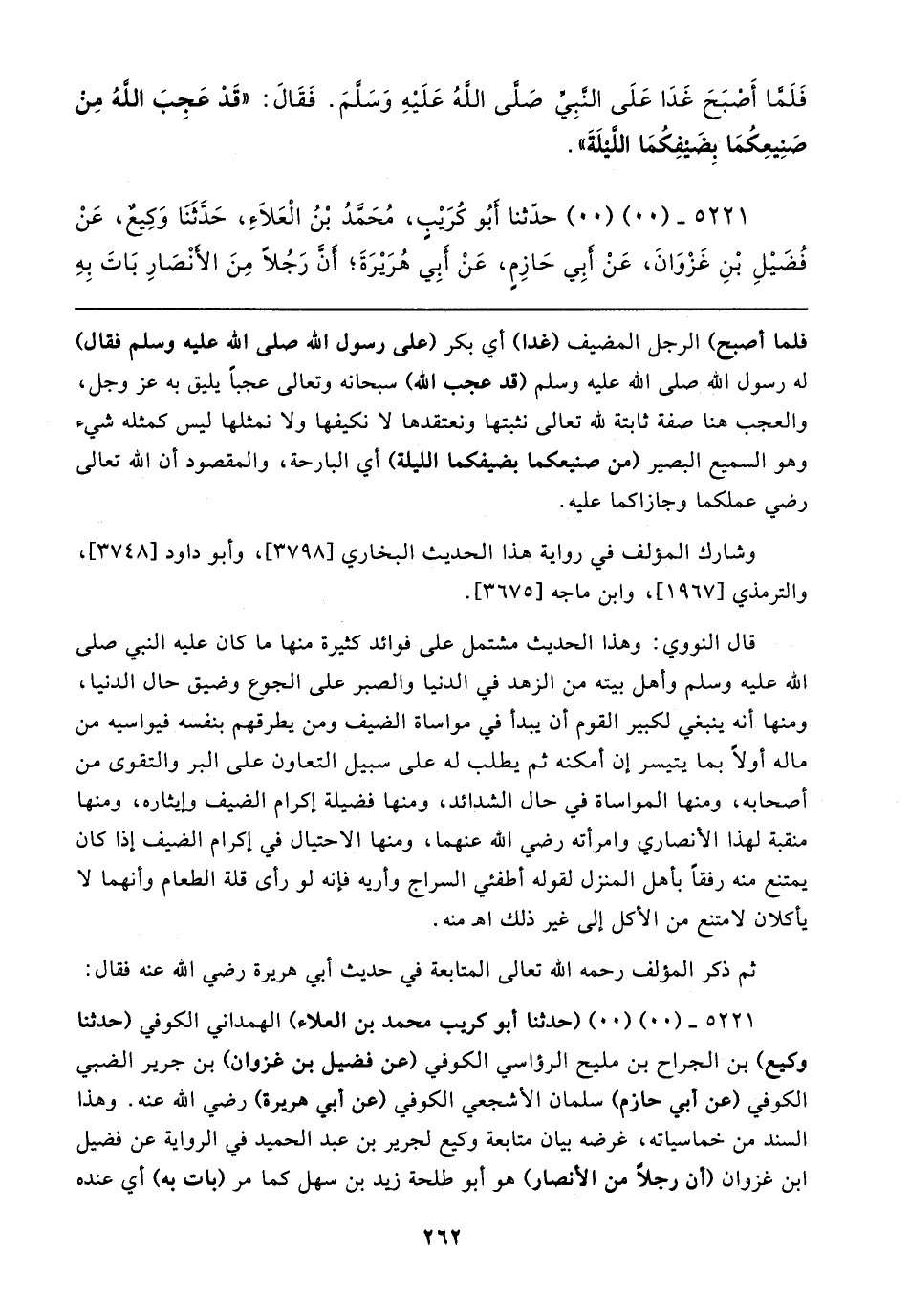 ٥٢٢١ - (٠٠) (٠٠) (حدثنا أبو كريب محمَّد بن العلاء) الهمداني الكوفي (حدثنا وكيع) بن الجراح بن مليح الرؤاسي الكوفي (عن فضيل بن غزوان) بن جرير الضبي الكوفي (عن أبي حازم) سلمان الأشجعي الكوفي (عن أبي هريرة) رضي الله عنه. وهذا السند من خماسياته، غرضه بيان متابعة وكيع لجرير بن عبد الحميد في الرواية عن فضيل بن غزوان (أن رجلًا من الأنصار) هو أبو طلحة زيد بن سهل كما مر (بات به) أي عنده