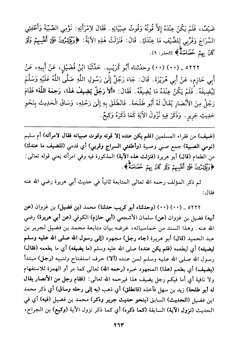 ٥٢٢٢ - (٠٠) (٠٠) وحدّثناه أَبُو كُرَيبٍ. حَدَّثَنَا ابْنُ فُضَيلٍ، عَنْ أَبِيهِ، عَنْ أَبِي حَازِمٍ، عَنْ أَبِي هُرَيرَةَ. قَال: جَاءَ رَجُلٌ إلى رَسُولِ الله صَلى اللهُ عَلَيهِ وَسَلَّمَ لِيُضِيفَهُ. فَلَمْ يَكُنْ عِنْدَهُ مَا يُضِيفُهُ. فَقَال: "أَلا رَجُلٌ يُضِيفُ هذَا، رَحِمَهُ اللهُ" فَقَامَ رَجُلٌ مِنَ الأَنْصَارِ يُقَالُ لَهُ أَبُو طَلْحَةَ. فَانطَلَقَ بِهِ إلى رَحْلِهِ، وَسَاقَ الْحَدِيثَ بِنَحْو حَدِيثِ جَرِيرٍ. وَذَكَرَ فِيهِ نُزُولَ الآيَةِ كَمَا ذَكَرَهُ وَكِيعٌ