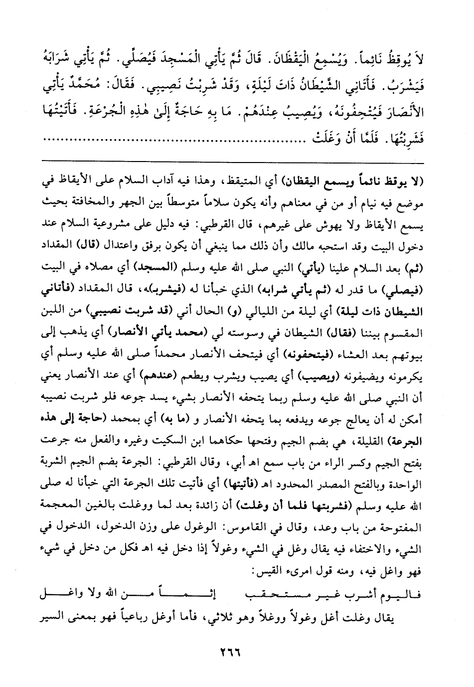 لَا يُوقِظُ نَائِمًا. وَيُسْمِعُ الْيَقظَانَ. قَال ثُمَّ يَأتِي الْمسْجِدَ فَيُصَلِّي. ثُمَّ يَأتِي شَرَابَهُ فَيَشْرَبُ. فَأَتَانِي الشيطَانُ ذَاتَ لَيلَةٍ، وَقَدْ شَرِبتُ نَصِيبِي. فَقَال: مُحَمَّدٌ يَأْتِي الأنصَارَ فَيُتْحِفُونَهُ، ويصِيبُ عِنْدَهُمْ. مَا بِهِ حَاجَة إلى هذِهِ الْجُرْعَةِ. فَأَتَيتُهَا فَشَرِبْتُهَا. فَلَمَّا أَنْ وَغَلَت