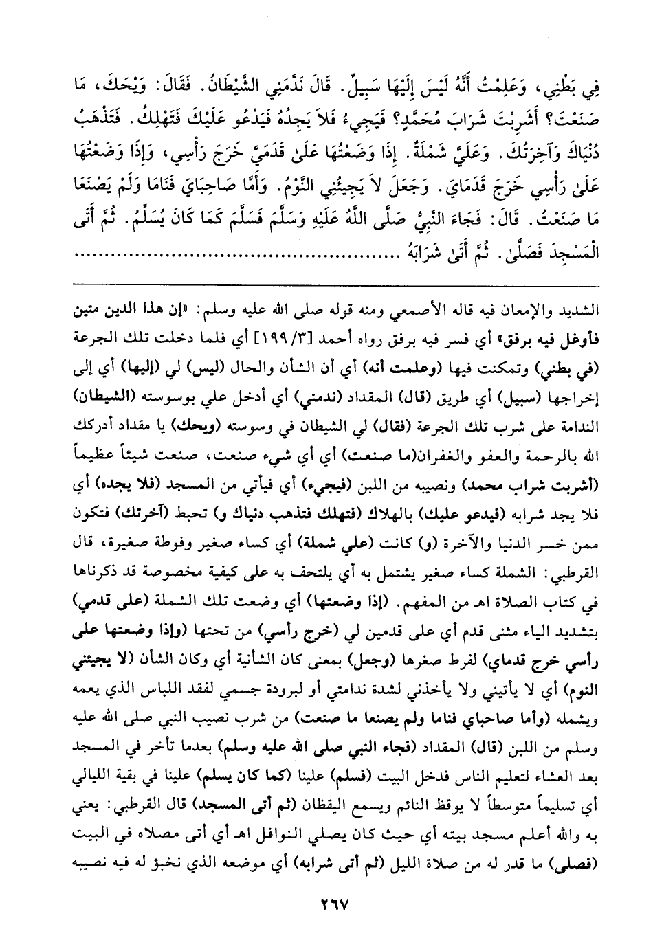 الشديد والإمعان فيه قاله الأصمعي ومنه قوله صلى الله عليه وسلم: "إن هذا الدين متين فأوغل فيه برفق" أي فسر فيه برفق رواه أحمد [٣/ ١٩٩] أي فلما دخلت تلك الجرعة (في بطني) وتمكنت فيها (وعلمت أنه) أي أن الشأن والحال (ليس) لي (إليها) أي إلى إخرا بها (سبيل) أي طريق (قال) المقداد (ندمني) أي أدخل علي بوسوسته (الشيطان) الندامة على شرب تلك الجرعة (فقال) لي الشيطان في وسوسته (ويحك) يا مقداد أدركك الله بالرحمة والعفو والغفران (ما صنعت) أي أي شيء صنعت، صنعت شيئًا عظيمًا (أشربت شراب محمَّد) ونصيبه من اللبن (فيجيء) أي فيأتي من المسجد (فلا يجده) أي فلا يجد شرابه (فيدعو عليك) بالهلاك (فتهلك فتذهب دنياك و) تحبط (آخرتك) فتكون ممن خسر الدنيا والآخرة (و) كانت (علي شملة) أي كساء صغير وفوطة صغيرة، قال القرطبي: الشملة كساء صغير يشتمل به أي يلتحف به على كيفية مخصوصة قد ذكرناها في كتاب الصلاة اهـ من المفهم. (إذا وضعتها) أي وضعت تلك الشملة (على قدمي) بتشديد الياء مثنى قدم أي على قدمين لي (خرج رأسي) من تحتها (وإذا وضعتها على رأسي خرج قدماي) لفرط صغرها (وجعل) بمعنى كان الثانية أي وكان الشأن (لا يجيئني النوم) أي لا يأتيني ولا يأخذني لشدة ندامتي أو لبرودة جسمي لفقد اللباس الذي يعمه ويشمله (وأما صاحباي فناما ولم يصنعا ما صنعت) من شرب نصيب النبي صلى الله عليه وسلم من اللبن (قال) المقداد (فجاء النبي صلى الله عليه وسلم) بعد ما تأخر في المسجد بعد العشاء لتعليم الناس فدخل البيت (فسلم) علينا (كما كان يسلم) علينا في بقية الليالي أي تسليمًا متوسطًا لا يوقظ النائم ويسمع اليقظان (ثم أتى المسجد) قال القرطبي: يعني به والله أعلم مسجد بيته أي حيث كان يصلي النوافل اهـ أي أتى مصلاه في البيت (فصلى) ما قدر له من صلاة الليل (ثم أتى شرابه) أي موضعه الذي نخبؤ له فيه نصيبه