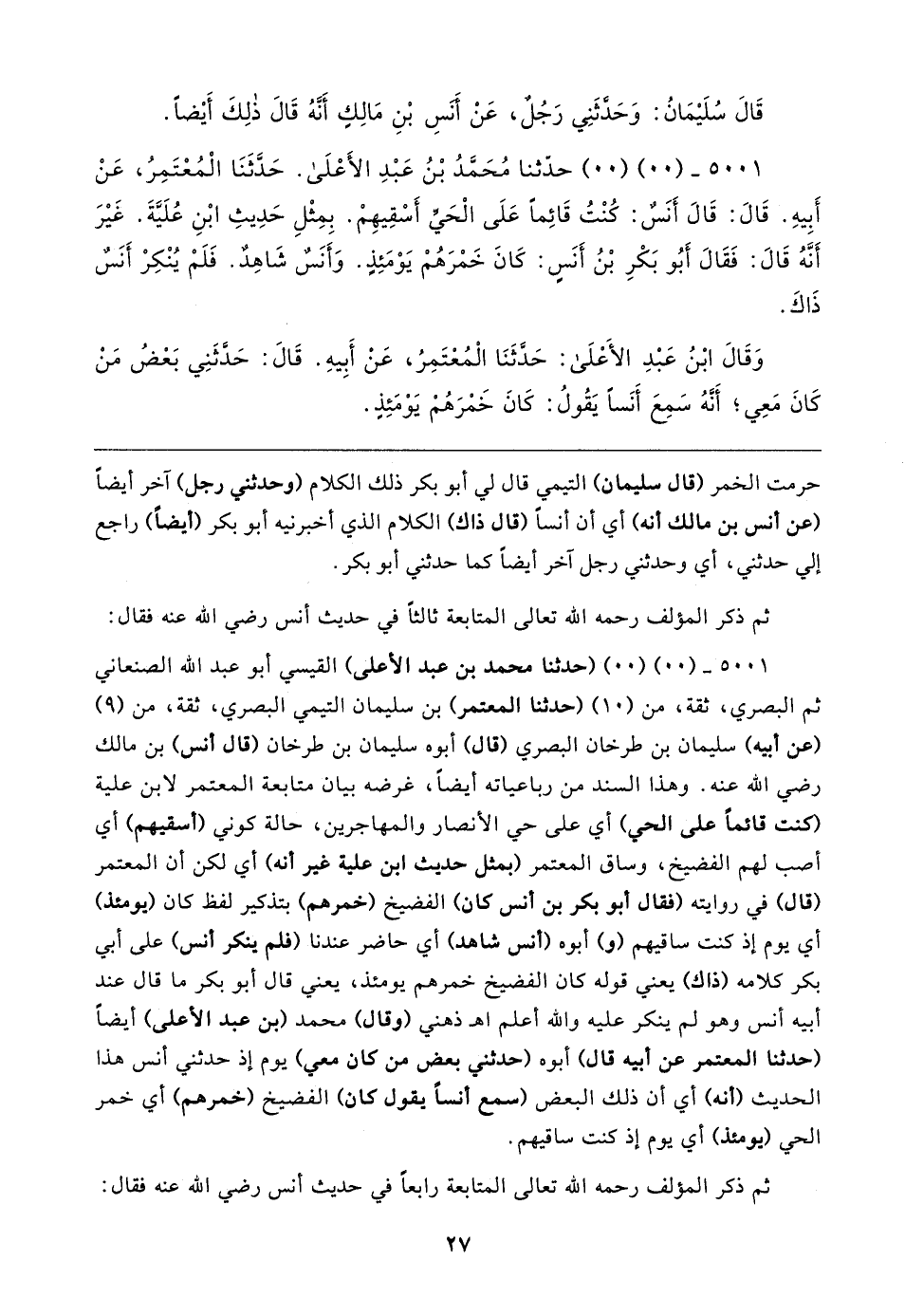 ٥٠٠١ - (٠٠) (٠٠) (حدثنا محمَّد بن عبد الأعلى) القيسي أبو عبد الله الصَّنْعانِيّ ثم البَصْرِيّ، ثِقَة، من (١٠) (حَدَّثَنَا المعتمر) بن سليمان التَّيميّ البَصْرِيّ، ثِقَة، من (٩) (عن أَبيه) سليمان بن طرخان البَصْرِيّ (قال) أبوه سليمان بن طرخان (قال أنس) بن مالك رضي الله عنه. وهذا السند من رباعياته أَيضًا، غرضه بيان متابعة المعتمر لابن عليّة (كنت قائمًا على الحي) أي على حي الأَنصار والمهاجرين، حالة كوني (أسقيهم) أي أصب لهم الفضيخ، وساق المعتمر (بمثل حديث ابن عليّة غير أنَّه) أي لكن أن المعتمر (قال) في روايته (فقال أبو بكر بن أنس كان) الفضيخ (خمرهم) بتذكير لفظ كان (يومئذ) أي يوم إذ كنت ساقيهم (و) أبوه (أنس شاهد) أي حاضر عندنا (فلم ينكر أنس) على أبي بكر كلامه (ذاك) يعني قوله كان الفضيخ خمرهم يومئذ، يعني قال أبو بكر ما قال عند أَبيه أنس وهو لم ينكر عليه والله أعلم اهـ ذهني (وقال) محمَّد (بن عبد الأعلى) أَيضًا (حدثنا المعتمر عن أَبيه قال) أبوه (حَدَّثني بعض من كان معي) يوم إذ حَدَّثني أنس هذا الحديث (أنَّه) أي أن ذلك البعض (سمع أنسًا يقول كان) الفضيخ (خمرهم) أي خمر الحي (يومئذ) أي يوم إذ كنت ساقيهم.