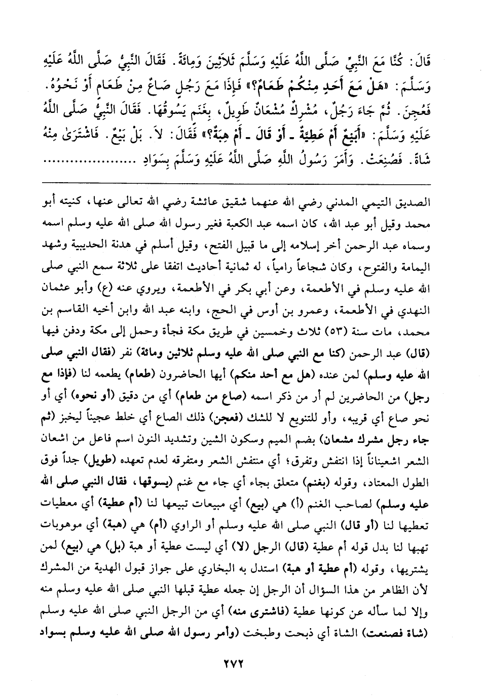 الصديق التيمي المدني رضي الله عنهما شقيق عائشة رضي الله تعالى عنها، كنيته أبو محمَّد وقيل أبو عبد الله، كان اسمه عبد الكعبة فغير رسول الله صلى الله عليه وسلم اسمه وسماه عبد الرحمن أخر إسلامه إلى ما قبيل الفتح، وقيل أسلم في هدنة الحديبية وشهد اليمامة والفتوح، وكان شجاعًا راميًا، له ثمانية أحاديث اتفقا على ثلاثة سمع النبي صلى الله عليه وسلم في الأطعمة، وعن أبي بكر في الأطعمة، ويروي عنه (ع) وأبو عثمان النهدي في الأطعمة، وعمرو بن أوس في الحج، وابنه عبد الله وابن أخيه القاسم بن محمَّد، مات سنة (٥٣) ثلاث وخمسين في طريق مكة فجأة وحمل إلى مكة ودفن فيها (قال) عبد الرحمن (كنا مع النبي صلى الله عليه وسلم ثلاثين ومائة) نفر (فقال النبي صلى الله عليه وسلم) لمن عنده (هل مع أحد منكم) أيها الحاضرون (طعام) يطعمه لنا (فهذا مع رجل) من الحاضرين لم أر من ذكر اسمه (سماع من طعام) أي من دقيق (أو نحوه) أي أو نحو صاع أي قريبه، وأو للتنويع لا للشك (فعجن) ذلك الصالح أي خلط عجينًا ليخبز (ثم جاء رجل مشرك مشعان) بضم الميم وسكون الشين وتشديد النون اسم فاعل من اشعان الشعر اشعينانًا إذا انتفش وتفرق؛ أي منتفش الشعر ومتفرقه لعدم تعهده (طويل) جدًّا فوق الطول المعتاد، وقوله (بغنم) متعلق بجاء أي جاء مع غنم (يسوقها، فقال النبي صلى الله عليه وسلم) لصاحب الغنم (١) هي (بيع) أي مبيعات تبيعها لنا (أم عطية) أي معطيات تعطيها لنا (أو قال) النبي صلى الله عليه وسلم أو الراوي (أم) هي (هبة) أي موهوبات تهبها لنا بدل قوله أم عطية (قال) الرجل (لا) أي ليست عطية أو هبة (بل) هي (بيع) لمن يشتريها، وقوله (أم عطية أو هبة) استدل به البخاري على جواز قبول الهدية من المشرك لأن الظاهر من هذا السؤال أن الرجل إن جعله عطية قبلها النبي صلى الله عليه وسلم منه وإلا لما سأله عن كونها عطية (فاشترى منه) أي من الرجل النبي صلى الله عليه وسلم (شاة فصنعت) الشاة أي ذبحت وطبخت (وأمر رسول الله صلى الله عليه وسلم بسواد