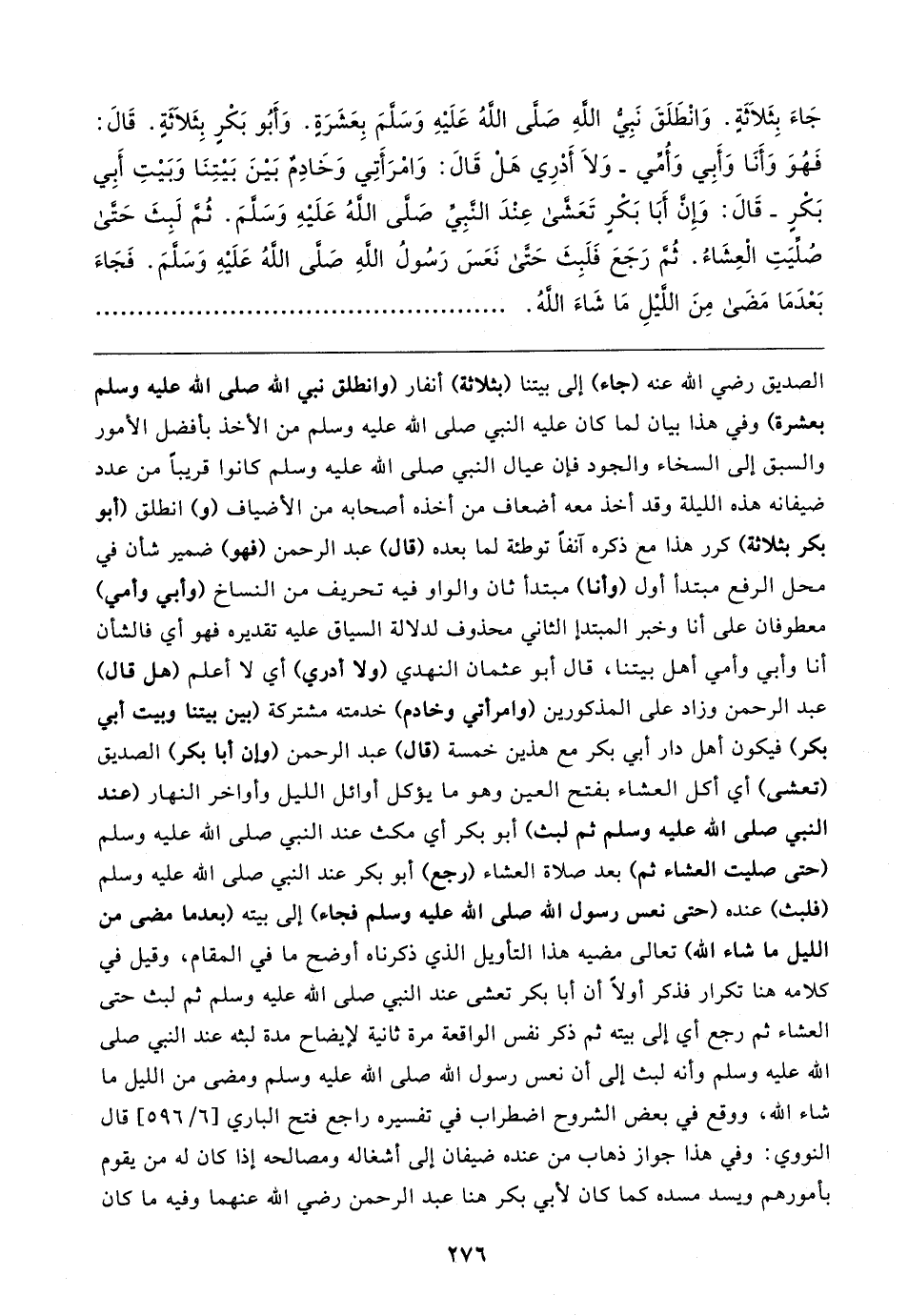 جَاءَ بِثَلاثَةٍ. وَانْطلَقَ نَبِي الله صَلى الله عَلَيهِ وَسلمَ بِعَشَرَةٍ. وَأَبُو بَكْرِ بِثَلاثَةٍ. قَال: فَهُوَ وَأَنَا وَأَبِي وَأُمِّي -وَلَا أَدْرِي هَلْ قَال: وَامْرَأتِي وَخَادِمٌ بَينَ بَيتِنَا وَبَيتِ أَبِي بَكْرٍ- قَال: وَإِن أَبَا بَكْرٍ تَعَشى عِنْدَ النبِي صلى الله عَلَيهِ وَسلمَ. ثُمَّ لَبِثَ حَتى صُلِّيَتِ الْعِشَاءُ. ثُمَّ رَجَعَ فَلَبِثَ حَتَّى نَعَسَ رَسُولُ الله صلى الله عَلَيهِ وَسلمَ. فَجَاءَ بَعْدَمَا مَضى مِنَ الليلِ مَا شَاءَ الله