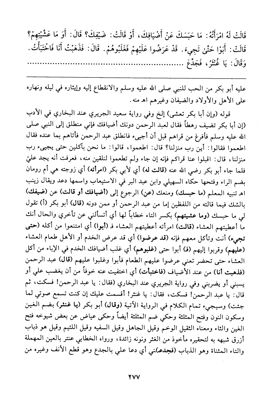 قوله (وإن أبا بكر تعشى) إلخ وفي رواية سعيد الجريري عند البخاري في الأدب (إن أبا بكر تضيف رهطًا فقال لعبد الرحمن دونك أضيافك فإني منطلق إلى النبي صلى الله عليه وسلم فأفرغ من قراهم قبل أن أجيئ فانطلق عبد الرحمن فأتاهم بما عنده فقال اطعموا فقالوا: أين رب منزلنا؟ قال: اطعموا، قالوا: ما نحن بآكلين حتى يجيئ رب منزلنا، قال: اقبلوا عنا قراكم فإنه إن جاء ولم تطعموا لنلقين منه، فعرفت أنه يجد علي فلما جاء أبو بكر رضي الله عنه (قالت له) أي لأبي بكر (امرأته) أي زوجته هي أم رومان بضم الراء وفتحها حكاه السهيلي وابن عبد البر في الاستيعاب واسمها دعد ويقال زينب اهـ تنبيه المعلم (ما حبسك) ومنعك (عن) الرجوع إلى (أضيافك أو قالت) عن (ضيفك) بالشك فيما قالته من اللفظين إما من عبد الرحمن أو ممن دونه (قال) أبو بكر (أ) تقول لي ما حبسك (وما عشيتهم) بكسر التاء خطابًا لها أي أتسالني عن تأخري والحال أنك ما أعطيتهم العشاء (قالت) امرأته أعطيتهم العشاء فـ (أبوا) أي امتنعوا من أكله (حتى تجيء) أنت وتأكل معهم فإنه (قد عرضوا) أي قد عرض الخدم أو الأهل طعام العشاء (عليهم) وقربوا إليهم (فـ) أبوا حتى (غلبوهم) أي غلب أضيافك الخدم في الإباء من أكل العشاء حتى تحضر تعني عرضوا عليهم الطعام فابوا وغلبوا عليهم (قال) عبد الرحمن (فذهبت أنا) من عند الأضياف (فاختبأت) أي اختفيت عنه خوفًا من أن يغضب علي أو يسبني أو يضربني وفي رواية الجريري عند البخاري (فقال: يا عبد الرحمن! فسكت، ثم قال: يا عبد الرحمن! فسكت، فقال: يا غنثر! أقسمت عليك إن كنت تسمع صوتي لما جئت) وسيجيء تمام الكلام في الرواية الآتية (وقال) أبو بكر (يا غنثر) بضم الغين وسكون النون وفتح المثلثة وحكي ضم المثلثة أيضًا وحكى عياض عن بعض شيوخه فتح الغين والثاء ومعناه الثقيل الوخم وقيل الجاهل وقيل السفيه وقيل اللئيم وقيل هو ذباب أزرق شبهه به لتحقيره مأخوذ من الغثر ونونه زائدة، ورواه الخطابي عنتر بالعين المهملة والتاء المثناة وهو الذباب (فجدعـ) ـني أي دعا علي بالجدع وهو قطع الأنف وغيره من