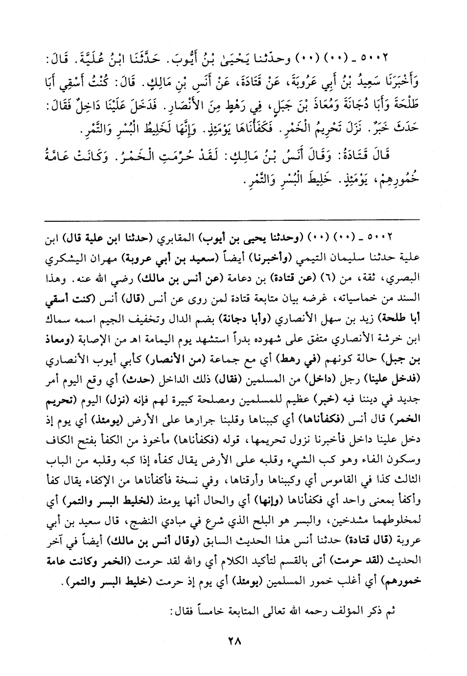 ٥٠٠٢ - (٠٠) (٠٠) (وحدثنا يحيى بن أَيُّوب) المقابري (حَدَّثَنَا ابن عُليّة قال) ابن علية حَدَّثَنَا سليمان التَّيميّ (وأخبرنا) أَيضًا (سعيد بن أبي عروبة) مهران اليشكري البَصْرِيّ، ثِقَة، من (٦) (عن قتادة) بن دعامة (عن أنس بن مالك) رضي الله عنه. وهذا السند من خماسياته، غرضه بيان متابعة قتادة لمن روى عن أنس (قال) أنس (كنت أسقي أَبا طلحة) زيد بن سهل الأَنْصَارِيّ (وأبا دجانة) بضم الدال وتخفيف الجيم اسمه سماك بن خرشة الأَنْصَارِيّ متفق على شهوده بدرًا استشهد يوم اليمامة اهـ من الإصابة (ومعاذ بن جبل) حالة كونهم (في رهط) أي مع جماعة (من الأَنصار) كأبي أَيُّوب الأَنْصَارِيّ (فدخل علينا) رجل (داخل) من المسلمين (فقال) ذلك الداخل (حدث) أي وقع اليوم أمر جديد في ديننا فيه (خبر) عظيم للمسلمين ومصلحة كبيرة لهم فإنَّه (نزل) اليوم (تحريم الخمر) قال أنس (فكفأناها) أي كببناها وقلبنا جرارها على الأرض (يومئذ) أي يوم إذ دخل علينا داخل فأخبرنا نزول تحريمها، قوله (فكفأناها) مأخوذ من الكفأ بفتح الكاف وسكون الفاء وهو كب الشيء وقلبه على الأرض يقال كفأه إذا كبه وقلبه من الباب الثالث كذا في القاموس أي وكببناها وأرقناها، وفي نسخة فاكفأناها من الإكفاء يقال كفأ وأكفأ بمعنى واحد أي فكفأناها (وإنها) أي والحال أنها يومئذ (لخليط البسر والتَّمر) أي لمخلوطهما مشدخين، والبسر هو البلح الذي شرع في مبادي النضج، قال سعيد بن أبي عروبة (قال قتادة) حدثنا أنس هذا الحديث السابق (وقال أنس بن مالك) أَيضًا في آخر الحديث (لقد حرمت) أتى بالقسم لتأكيد الكلام أي والله لقد حرمت (الخمر وكانت عامة خمورهم) أي أغلب خمور المسلمين (يومئذ) أي يوم إذ حرمت (خليط البسر والتمر).