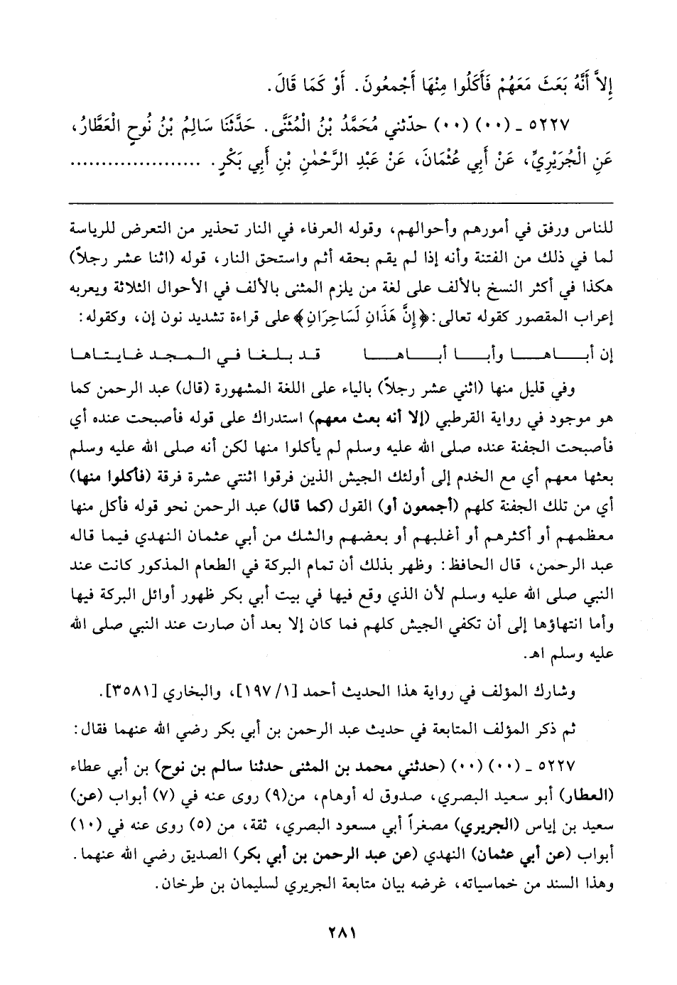 ٥٢٢٧ - (٠٠) (٠٠) (حدثني محمَّد بن المثنى حدثنا سالم بن نوح) بن أبي عطاء (العطار) أبو سعيد البصري، صدوق له أوهام، من (٩) روى عنه في (٧) أبواب (عن) سعيد بن إياس (الجريري) مصغرًا أبي مسعود البصري، ثقة، من (٥) روى عنه في (١٠) أبواب (عن أبي عثمان) النهدي (عن عبد الرحمن بن أبي بكر) الصديق رضي الله عنهما. وهذا السند من خماسياته، غرضه بيان متابعة الجريري لسليمان بن طرخان.