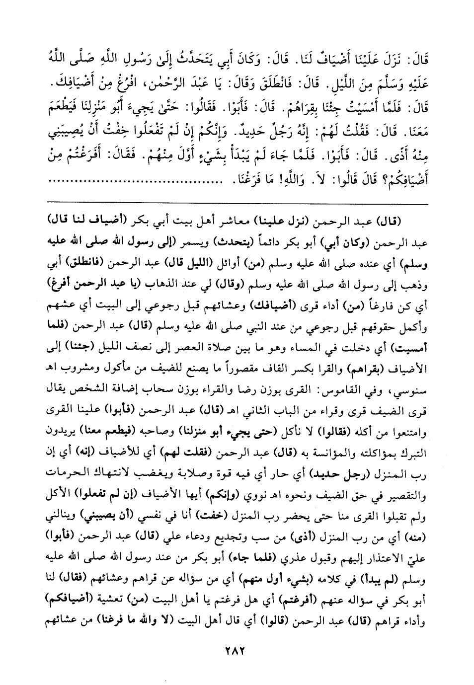 قَال: نَزَلَ عَلَينَا أَضْيَافٌ لَنَا. قَال: وَكَانَ أبي يَتَحَدَّثُ إلى رَسُولِ الله صَلى اللهُ عَلَيهِ وَسلمَ مِنَ الليلِ. قَال: فَانْطَلَقَ وَقَال: يَا عَبدَ الرَّحْمن، افْرُغْ مِنْ أَضْيَافِكَ. قَال: فَلَمَّا أَمْسَيتُ جِئْنَا بِقِرَاهُمْ. قَال: فَأَبَوْا. فَقَالُوا: حَتى يَجِيءَ أَبُو مَنْزِلِنَا فَيَطْعَمَ مِنْهُ. قَال: فَقُلْتُ لَهُمْ: إنهُ رَجُلٌ حَدِيدٌ. وَإِنَّكُمْ إن لَمْ تَفْعَلُوا خِفْتُ أَنْ يُصِيبَنِي قَال: فَأبَوْا. فَلَمَّا جَاءَ لَمْ يَبْدَأْ بِشَيءٍ أوَّلَ مِنْهُمْ. فَقَال: أَفَرَغْتُم مِنْ أَضْيَافكم؟ قَال قَالُوا: لَا. وَاللهِ! مَا فَرَغْنَا