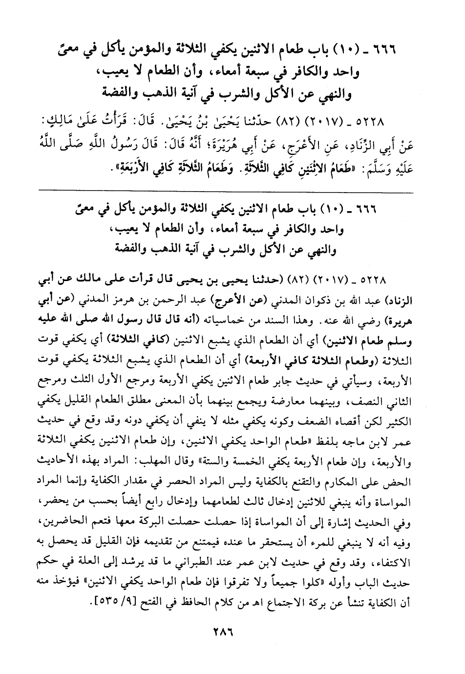 ٥٢٢٨ - (٢٠١٧) (٨٢) حدَّثنا يَحْيَى بْنُ يَحْيَى. قَال: قَرَأتُ عَلَى مَالِكٍ: عَنْ أَبِي الزِّنَادِ، عَنِ الأَعْرَجِ، عَنْ أَبِي هُرَيرَةَ؛ أَنَّهُ قَال: قَال رَسُولُ الله - صلى الله عليه وسلم -: "طَعَامُ الاثْنَينِ كَافِي الثلاثةِ. وَطَعَامُ الثلاثةِ كَافِي الأَرْبَعَةِ"