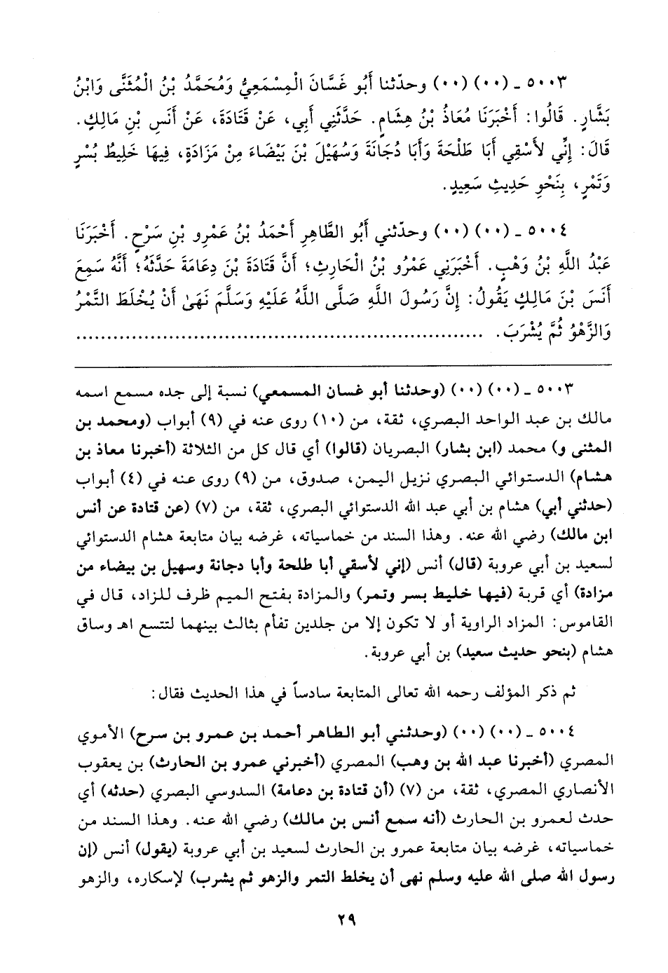 ٥٠٠٤ - (٠٠) (٠٠) (وحدثني أبو الطاهر أَحْمد بن عمرو بن سرح) الأُموي المصري (أخبرنا عبد الله بن وهب) المصري (أخبرني عمرو بن الحارث) بن يعقوب الأَنْصَارِيّ المصري، ثِقَة، من (٧) (أن قتادة بن دعامة) السدوسي البَصْرِيّ (حدثه) أي حدث لعمرو بن الحارث (أنَّه سمع أنس بن مالك) رضي الله عنه. وهذا السند من خماسياته، غرضه بيان متابعة عمرو بن الحارث لسعيد بن أبي عروبة (يقول) أنس (أن رسول الله صلى الله عليه وسلم نهى أن يخلط التمر والزهو ثم يشرب) لإسكاره، والزهو