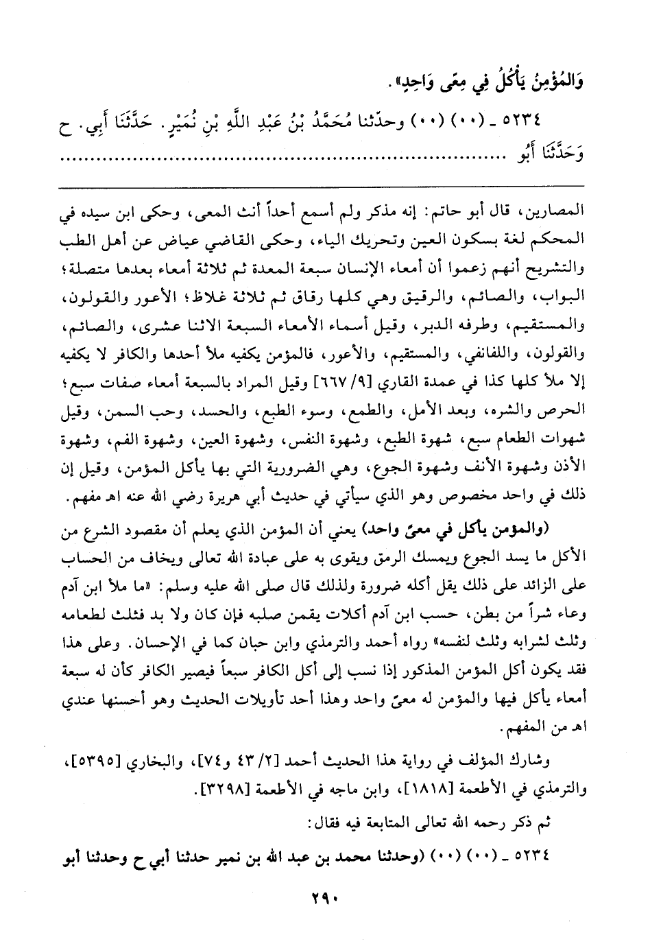 وَالمُؤْمِنُ يَأكلُ في مِعًى وَاحِدٍ".