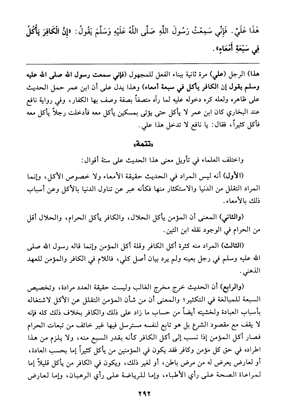 (الأول) أنه ليس المراد في الحديث حقيقة الأمعاء ولا خصوص الأكل، وإنما المراد التقلل من الدنيا والاستكثار منها فكأنه عبر عن تناول الدنيا بالأكل وعن أسباب ذلك بالأمعاء.
