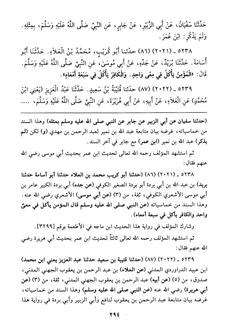 ٥٢٣٨ - (٢٠٢١) (٨٦) حدثنا أبو كريب محمد بن العلاء حدثنا أبو أسامة حدثنا بريد) بن عبد الله بن أبي بردة أبو بردة الصغير الكوفي (عن جده) أبي بردة الكبير عامر بن أبي موسى الأشعري الكوفي، ثقة، من (٣) (عن أبي موسى) الأشعري رضي الله عنه. وهذا السند من خماسياته (عن النبي صلى الله عليه وسلم قال المؤمن يأكل في معىً واحد والكافر يأكل في سبعة أمعاء).