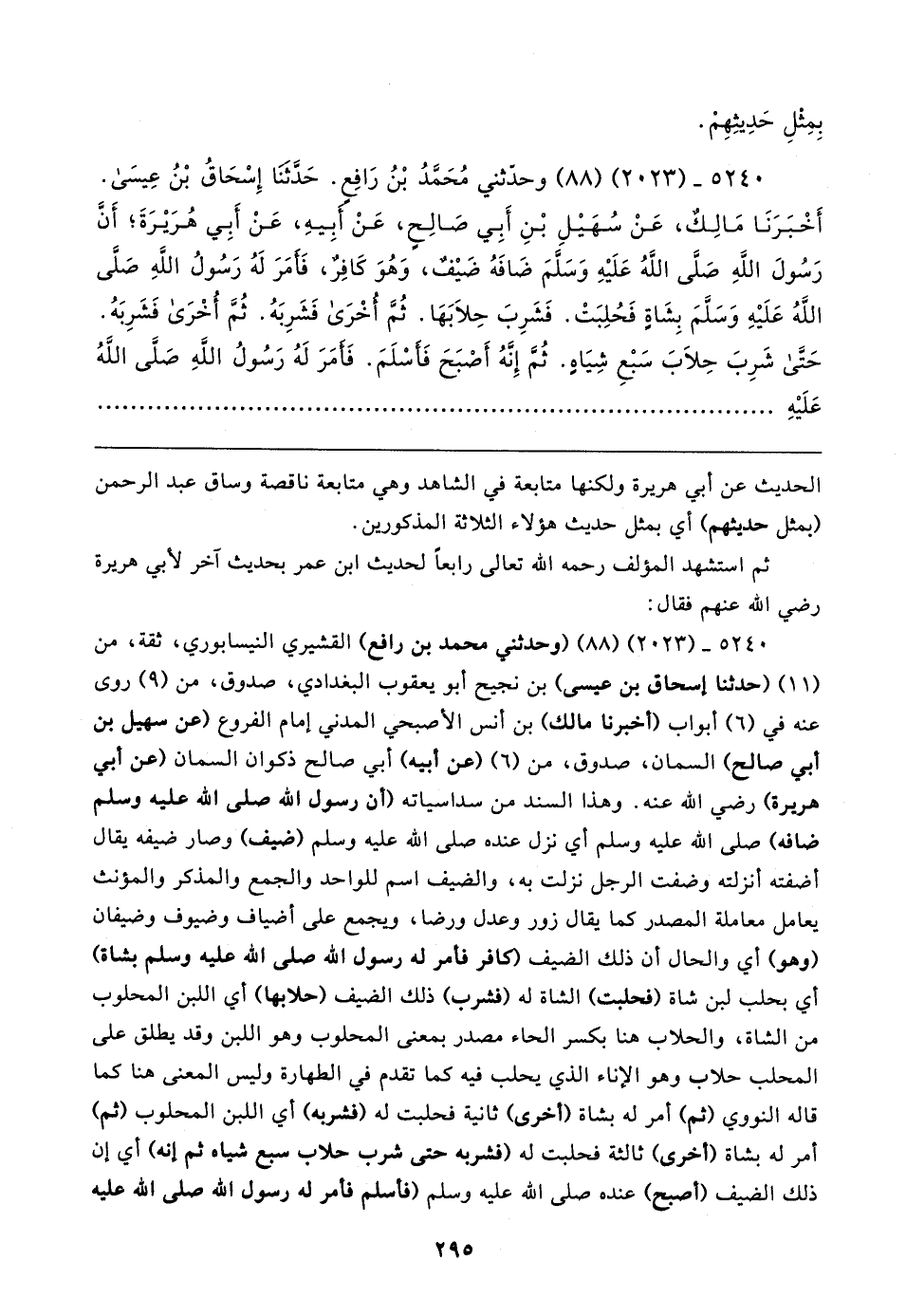 ٥٢٤٠ - (٢٠٢٣) (٨٨) (وحدثني محمد بن رافع) القشيري النيسابوري، ثقة، من (١١) (حدثنا إسحاق بن عيسى) بن نجيح أبو يعقوب البغدادي، صدوق، من (٩) روى عنه في (٦) أبواب (أخبرنا مالك) بن أنس الأصبحي المدني إمام الفروع (عن سهيل بن أبي صالح) السمان، صدوق، من (٦) (عن أبيه) أبي صالح ذكوان السمان (عن أبي هريرة) رضي الله عنه. وهذا السند من سداسياته (أن رسول الله - صلى الله عليه وسلم - ضافة) صلى الله عليه وسلم أي نزل عنده صلى الله عليه وسلم (ضيف) وصار ضيفه يقال أضفته أنزلته وضفت الرجل نزلت به، والضيف اسم للواحد والجمع والمذكر والمؤنث يعامل معاملة المصدر كما يقال زور وعدل ورضا، ويجمع على أضياف وضيوف وضيفان (وهو) أي والحال أن ذلك الضيف (كافر فأمر له رسول الله صلى الله عليه وسلم بشاة) أي بحلب لبن شاة (فحلبت) الشاة له (فشرب) ذلك الضيف (حلابها) أي اللبن المحلوب من الشاة، والحلاب هنا بكسر الحاء مصدر بمعنى المحلوب وهو اللبن وقد يطلق على المحلب حلاب وهو الإناء الذي يحلب فيه كما تقدم في الطهارة وليس المعنى هنا كما قاله النووي (ثم) أمر له بشاة (أخرى) ثانية فحلبت له (فشربه) أي اللبن المحلوب (ثم) أمر له بشاة (أخرى) ثالثة فحلبت له (فشربه حتى شرب حلاب سبع شياه ثم إنه) أي إن ذلك الضيف (أصبح) عنده صلى الله عليه وسلم (فأسم فأمر له رسول الله - صلى الله عليه