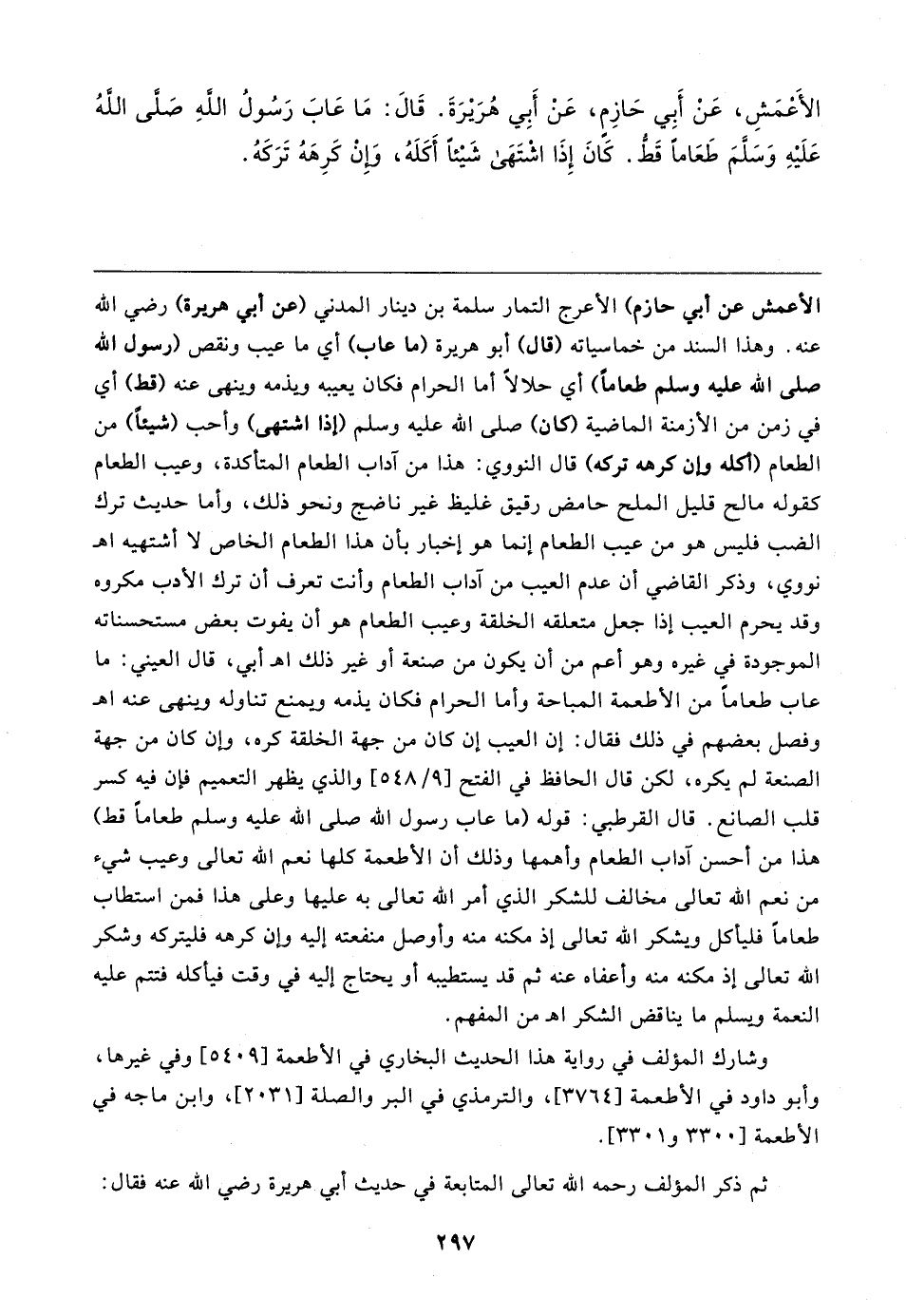 الأَعْمَشِ، عَنْ أَبِي حَازِمٍ، عَنْ أَبِي هُرَيرَةَ. قَال: مَا عَابَ رَسُولُ اللهِ صَلَّى اللهُ عَلَيهِ وَسَلَّمَ طَعَامًا قَطُّ. كَانَ إِذَا اشتَهَى شَيئًا أَكَلَهُ، وَإِنْ كَرِهَهُ تَرَكَهُ