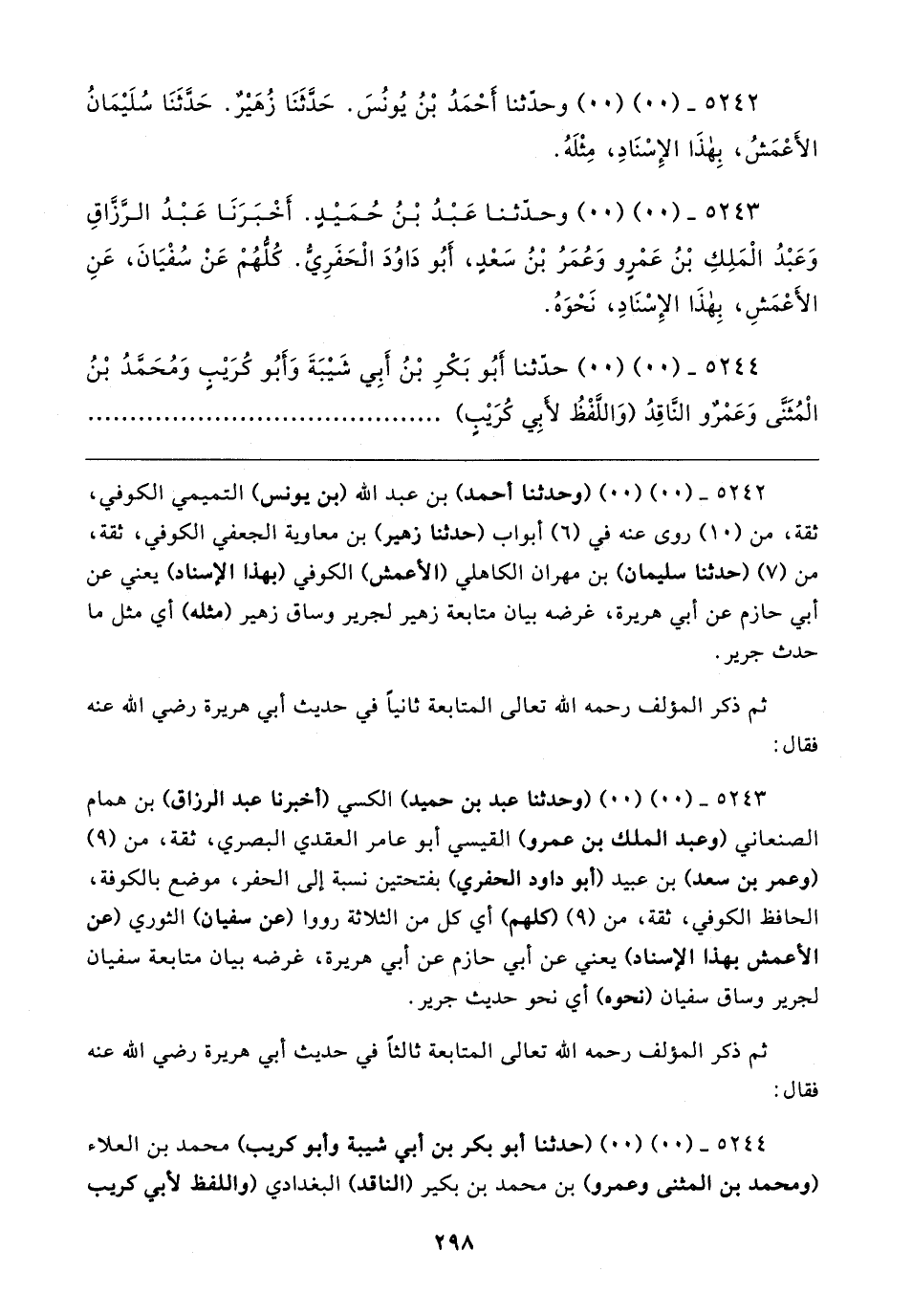 ٥٢٤٢ - (٠٠) (٠٠) (وحدثنا أحمد) بن عبد الله (بن يونس) التميمي الكوفي، ثقة، من (١٠) روى عنه في (٦) أبواب (حدثنا زهير) بن معاوية الجعفي الكوفي، ثقة، من (٧) (حدثنا سليمان) بن مهران الكاهلي (الأعمش) الكوفي (بهذا الإسناد) يعني عن أبي حازم عن أبي هريرة، غرضه بيان متابعة زهير لجرير وساق زهير (مثله) أي مثل ما حدث جرير.