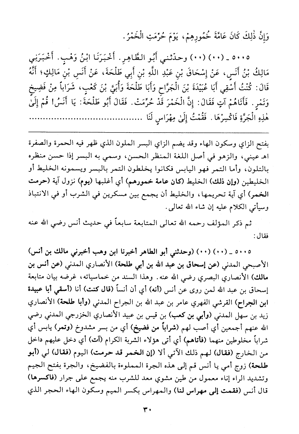٥٠٠٥ - (٠٠) (٠٠) وحدثني أَبُو الطَّاهِرِ. أَخْبَرَنَا ابْنُ وَهْب. أَخْبَرَنِي مَالِكُ بْنُ أَنَسٍ، عَنْ إِسْحَاقَ بْنِ عَبْدِ اللهِ بْنِ أَبِي طَلحَةَ، عَنْ أَنَسِ بْنِ مالك؛ أَنَّهُ قَال: كُنْتُ أَسْقِي أَبَا عُبَيدَةَ بْنَ الجَرَّاحِ وَأَبَا طَلحَةَ وَأُبَيَّ بْنَ كَعْب، شَرَابًا مِنْ فَضِيخٍ وَتَمْرٍ. فَأَتَاهُمْ آتٍ فَقَال: إِنَّ الخَمْرَ قَدْ حُرمَتْ. فَقَال أَبُو طَلحَةَ: يَا أَنَسُ! قُمْ إلى هذِهِ الجَرَّةِ فَاكْسِرْهَا. فَقُمْتُ إلى مِهْرَاسٍ لنَا