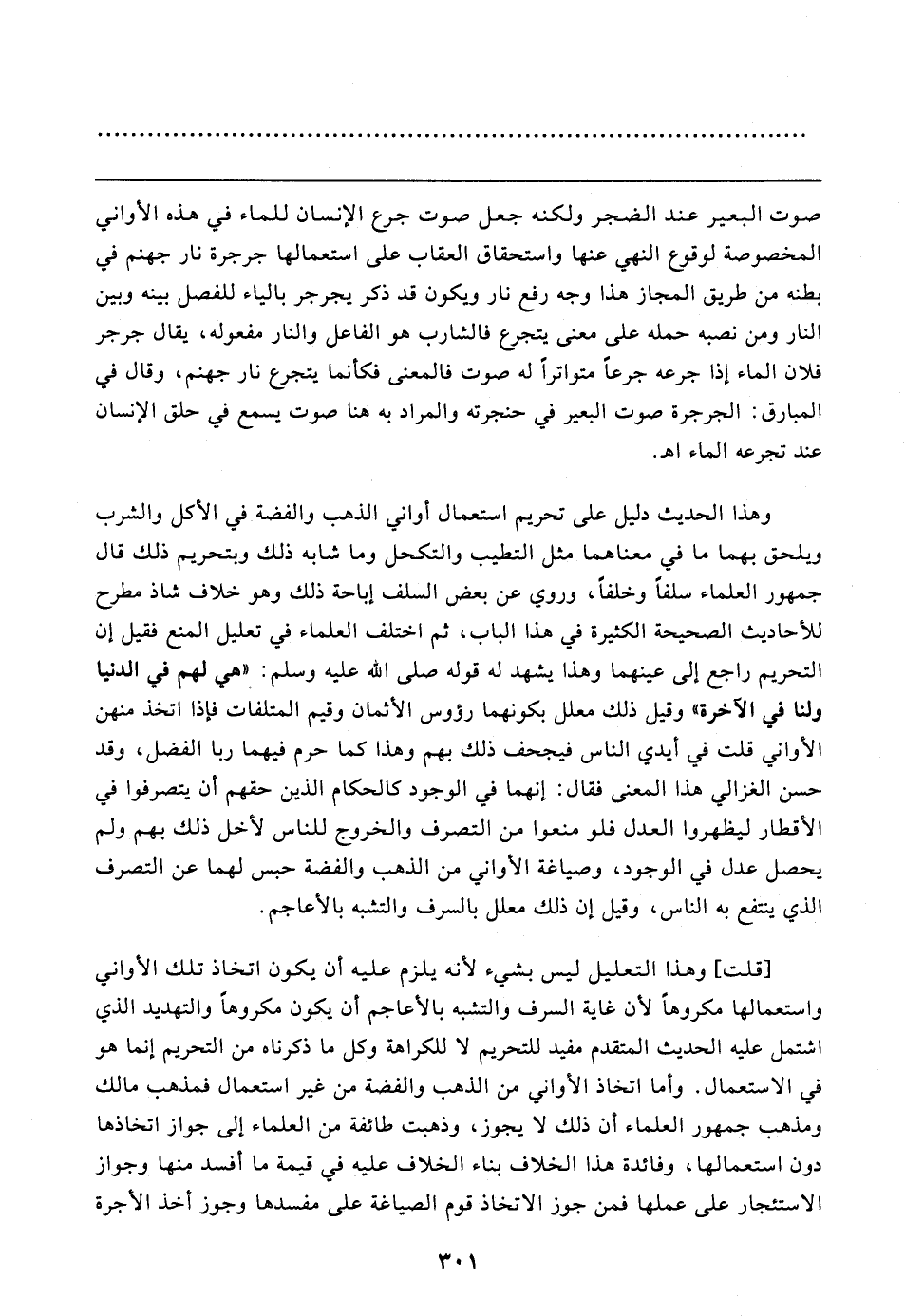 [قلت] وهذا التعليل ليس بشيء لأنه يلزم عليه أن يكون اتخاذ تلك الأواني واستعمالها مكروهًا لأن غاية السرف والتشبه بالأعاجم أن يكون مكروهًا والتهديد الذي اشتمل عليه الحديث المتقدم مفيد للتحريم لا للكراهة وكل ما ذكرناه من التحريم إنما هو في الاستعمال. وأما اتخاذ الأواني من الذهب والفضة من غير استعمال فمذهب مالك ومذهب جمهور العلماء أن ذلك لا يجوز، وذهبت طائفة من العلماء إلى جواز اتخاذها دون استعمالها، وفائدة هذا الخلاف بناء الخلاف عليه في قيمة ما أفسد منها وجواز الاستئجار على عملها فمن جوز الاتخاذ قوم الصياغة على مفسدها وجوز أخذ الأجرة