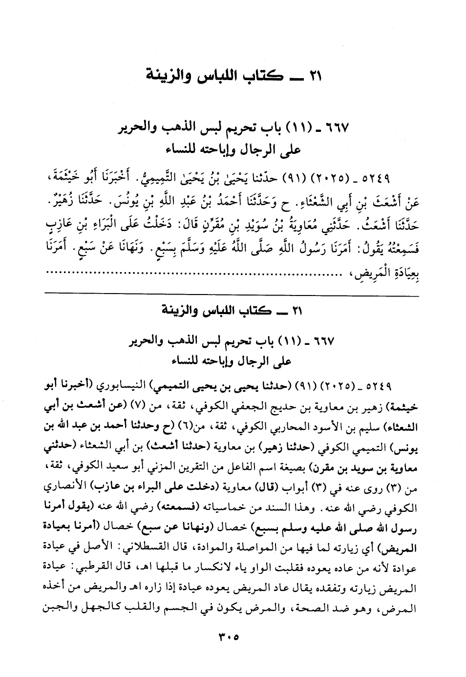 ٥٢٤٩ - (٢٠٢٥) (٩١) (حدثنا يحيى بن يحيى التميمي) النيسابوري (أخبرنا أبو خيثمة) زهير بن معاوية بن حديج الجعفي الكوفي، ثقة، من (٧) (عن أشعث بن أبي الشعثاء) سليم بن الأسود المحاربي الكوفي، ثقة، من (٦) (ح وحدثنا أحمد بن عبد الله بن يونس) التميمي الكوفي (حدثنا زهير) بن معاوية (حدثنا أشعث) بن أبي الشعثاء (حدثني معاوية بن سويد بن مقرن) بصيغة اسم الفاعل من التقرين المزني أبو سعيد الكوفي، ثقة، من (٣) روى عنه في (٣) أبواب (قال) معاوية (دخلت على البراء بن عازب) الأنصاري الكوفي رضي الله عنه. وهذا السند من خماسياته (فسمعته) رضي الله عنه (يقول أمرنا رسول الله صلى الله عليه وسلم بسبع) خصال (ونهانا عن سبع) خصال (أمرنا بعيادة المريض) أي زيارته لما فيها من المواصلة والموادة، قال القسطلاني: الأصل في عيادة عوادة لأنه من عاده يعوده فقلبت الواو ياء لانكسار ما قبلها اهـ، قال القرطبي: عيادة المريض زيارته وتفقده يقال عاد المريض يعوده عيادة إذا زاره اهـ والمريض من أخذه المرض، وهو ضد الصحة، والمرض يكون في الجسم والقلب كالجهل والجبن