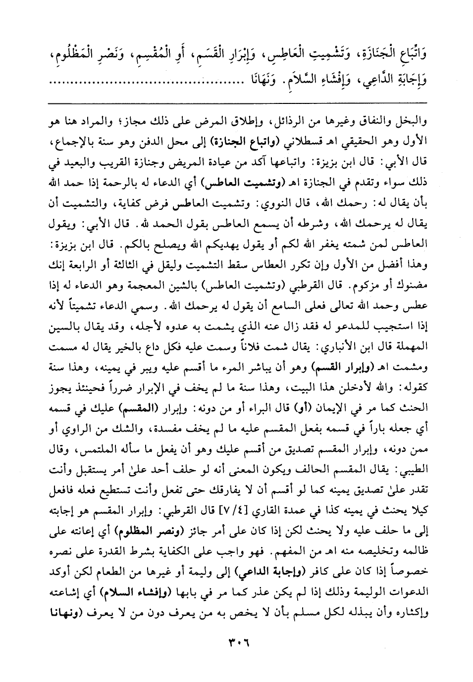 والبخل والنفاق وغيرها من الرذائل، وإطلاق المرض على ذلك مجاز؛ والمراد هنا هو الأول وهو الحقيقي اهـ قسطلاني (واتباع الجنازة) إلى محل الدفن وهو سنة بالإجماع، قال الأبي: قال ابن بزيزة: واتباعها آكد من عيادة المريض وجنازة القريب والبعيد في ذلك سواء وتقدم في الجنازة اهـ (وتشميث العاطس) أي الدعاء له بالرحمة إذا حمد الله بأن يقال له: رحمك الله، قال النووي: وتشميت العاطس فرض كفاية، والتشميت أن يقال له يرحمك الله، وشرطه أن يسمع العاطس بقول الحمد لله. قال الأبي: ويقول العاطس لمن شمته يغفر الله لكم أو يقول يهديكم الله ويصلح بالكم. قال ابن بزيزة: وهذا أفضل من الأول وإن تكرر العطاس سقط التشميت وليقل في الثالثة أو الرابعة إنك مضنوك أو مزكوم. قال القرطبي (وتشميت العاطس) بالشين المعجمة وهو الدعاء له إذا عطس وحمد الله تعالى فعلى السامع أن يقول له يرحمك الله. وسمي الدعاء تشميتًا لأنه إذا استجيب للمدعو له فقد زال عنه الذي يشمت به عدوه لأجله، وقد يقال بالسين المهملة قال ابن الأنباري: يقال شمت فلانًا وسمت عليه فكل داع بالخير يقال له مسمت ومشمت اهـ (وإبرار القسم) وهو أن يباشر المرء ما أقسم عليه ويبر في يمينه، وهذا سنة كقوله: والله لأدخلن هذا البيت، وهذا سنة ما لم يخف في الإبرار ضررًا فحينئذ يجوز الحنث كما مر في الإيمان (أو) قال البراء أو من دونه: وإبرار (المقسم) عليك في قسمه أي جعله بارًا في قسمه بفعل المقسم عليه ما لم يخف مفسدة، والشك من الراوي أو ممن دونه، وإبرار المقسم تصديق من أقسم عليك وهو أن يفعل ما سأله الملتمس، وقال الطيبي: يقال المقسم الحالف ويكون المعنى أنه لو حلف أحد علي أمر يستقبل وأنت تقدر علي تصديق يمينه كما لو أقسم أن لا يفارقك حتى تفعل وأنت تستطيع فعله فافعل كيلا يحنث في يمينه كذا في عمدة القاري [٤/ ٧] قال القرطبي: وإبرار المقسم هو إجابته إلى ما حلف عليه ولا يحنث لكن إذا كان على أمر جائز (ونصر المظلوم) أي إعانته على ظالمه وتخليصه منه اهـ من المفهم. فهو واجب على الكفاية بشرط القدرة على نصره خصوصًا إذا كان على كافر (وإجابة الداعي) إلى وليمة أو غيرها من الطعام لكن أوكد الدعوات الوليمة وذلك إذا لم يكن عذر كما مر في بابها (وإفشاء السلام) أي إشاعته وإكثاره وأن يبذله لكل مسلم بأن لا يخص به من يعرف دون من لا يعرف (ونهانا