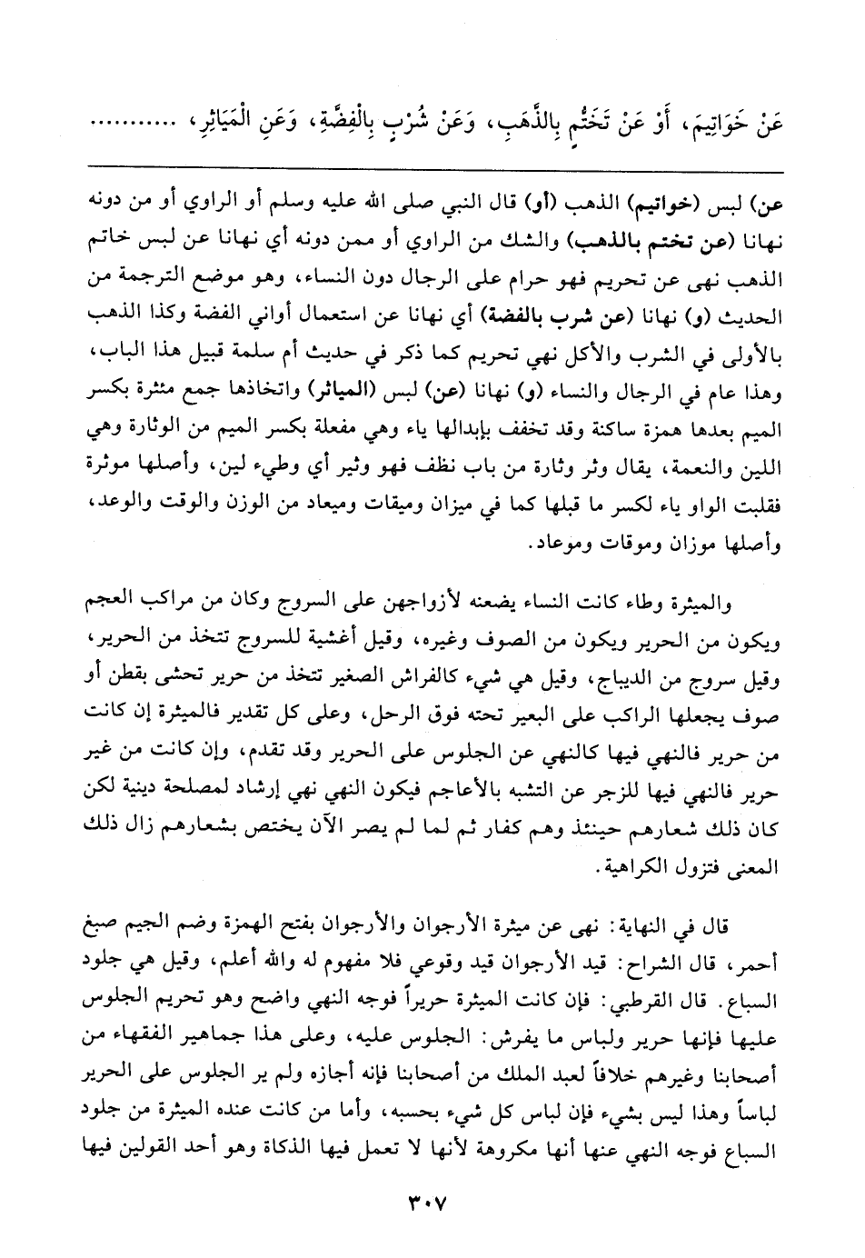 قال في النهاية: نهى عن ميثرة الأرجوان والأرجوان بفتح الهمزة وضم الجيم صبغ أحمر، قال الشراح: قيد الأرجوان قيد وقوعي فلا مفهوم له والله أعلم، وقيل هي جلود السباع. قال القرطبي: فإن كانت الميثرة حريرًا فوجه النهي واضح وهو تحريم الجلوس عليها فإنها حرير ولباس ما يفرش: الجلوس عليه، وعلى هذا جماهير الفقهاء من أصحابنا وغيرهم خلافًا لعبد الملك من أصحابنا فإنه أجازه ولم ير الجلوس على الحرير لباسًا وهذا ليس بشيء فإن لباس كل شيء بحسبه، وأما من كانت عنده الميثرة من جلود السباع فوجه النهي عنها أنها مكروهة لأنها لا تعمل فيها الذكاة وهو أحد القولين فيها
