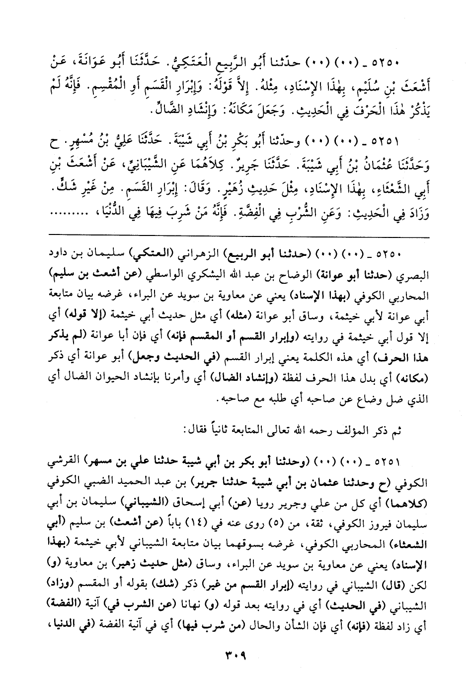٥٢٥١ - (٠٠) (٠٠) وحدّثنا أَبُو بَكْرِ بْنُ أَبِي شَيبَةَ. حَدَّثنَا عَلِيُّ بْنُ مُسْهِرٍ. ح وَحَدَّثَنَا عُثْمَانُ بْنُ أَبِي شَيبَةَ. حَدَّثَنَا جَرِيرٌ. كِلاهُمَا عَنِ الشَّيبَانِيِّ، عَنْ أَشْعَثَ بْنِ أَبِي الشَّعْثَاءِ، بِهذَا الإِسْنَادِ، مِثْلَ حَدِيثِ زُهَيرٍ. وَقَال: إِبْرَارِ القَسَمِ. مِنْ غَيرِ شَكٍّ. وَزَادَ في الْحَدِيثِ: وَعَنِ الشُّرْبِ في الْفِضَّةِ. فَإِنَّهُ مَنْ شَرِبَ فِيهَا في الذُّنْيَا،