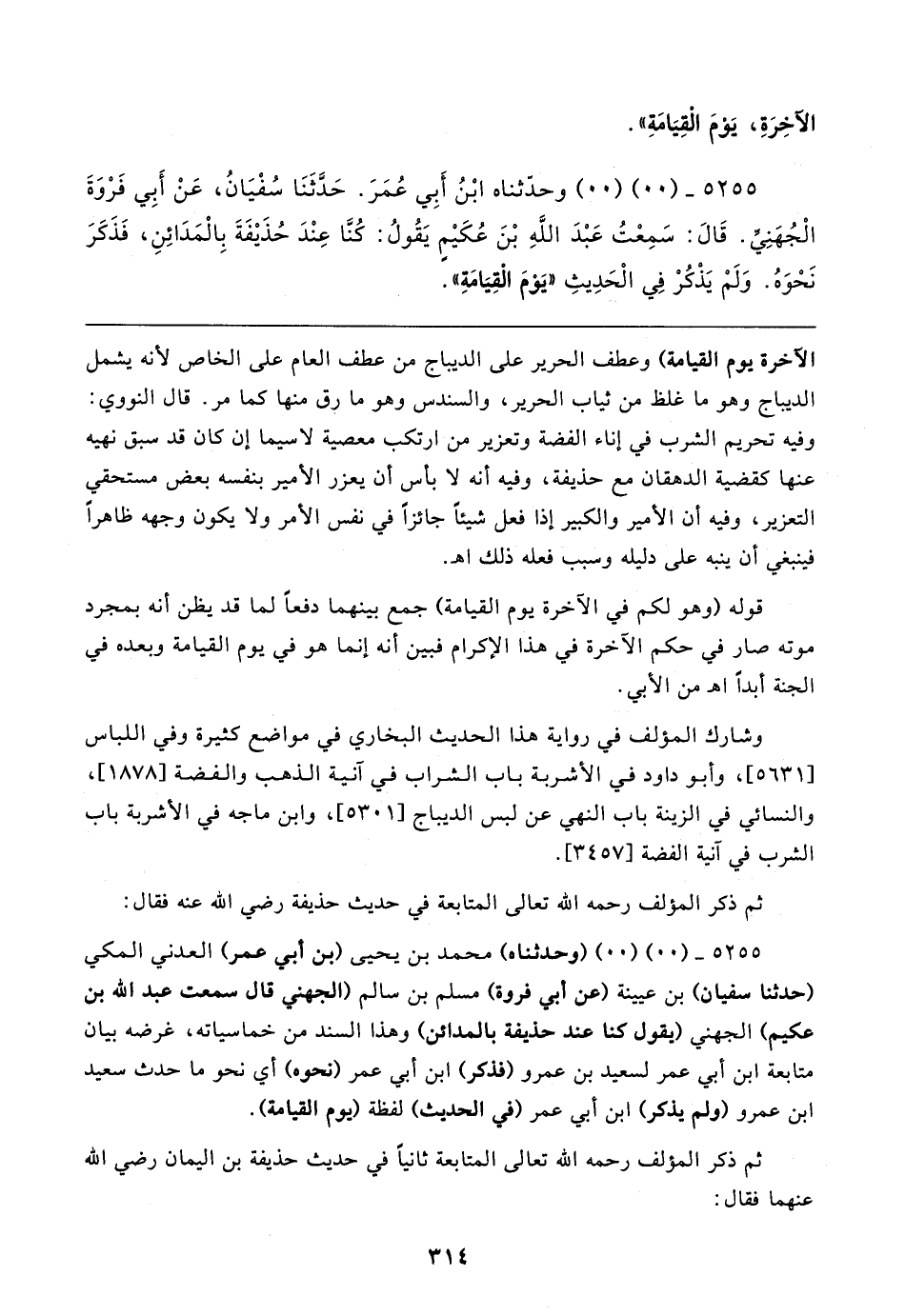 ٥٢٥٥ - (٠٠) (٠٠) (وحدثناه) محمد بن يحيى (بن أبي عمر) العدني المكي (حدثنا سفيان) بن عيينة (عن أبي فروة) مسلم بن سالم (الجهني قال سمعت عبد الله بن عكيم) الجهني (يقول كنا عند حذيفة بالمدائن) وهذا السند من خماسياته، غرضه بيان متابعة ابن أبي عمر لسعيد بن عمرو (فذكر) ابن أبي عمر (نحوه) أي نحو ما حدث سعيد بن عمرو (ولم يذكر) ابن أبي عمر (في الحديث) لفظة (يوم القيامة).