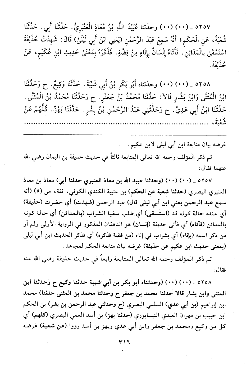 ٥٢٥٧ - (٠٠) (٠٠) (وحدثنا عبيد الله بن معاذ العنبري حدثنا أبي) معاذ بن معاذ العنبري البصري (حدثنا شعبة عن الحكم) بن عتيبة الكندي الكوفي، ثقة، من (٥) (أنه سمع عبد الرحمن يعني ابن أبي ليلى قال) عبد الرحمن (شهدت) أي حضرت (حذيفة) أي عنده حالة كونه قد (استسقى) أي طلب سقيا الشراب (بالمدائن) أي حالة كونه بالمدائن (فأتاه) أي فأتى حذيفة (إنسان) هو الدهقان المذكور في الرواية الأولى ولم أر من ذكر اسمه (بإناء) أي بشراب في إناء (من فضة فذكره) أي فذكر الحديث ابن أبي ليلى (بمعنى حديث ابن عكيم عن حذيفة) غرضه بيان متابعة الحكم لمجاهد.