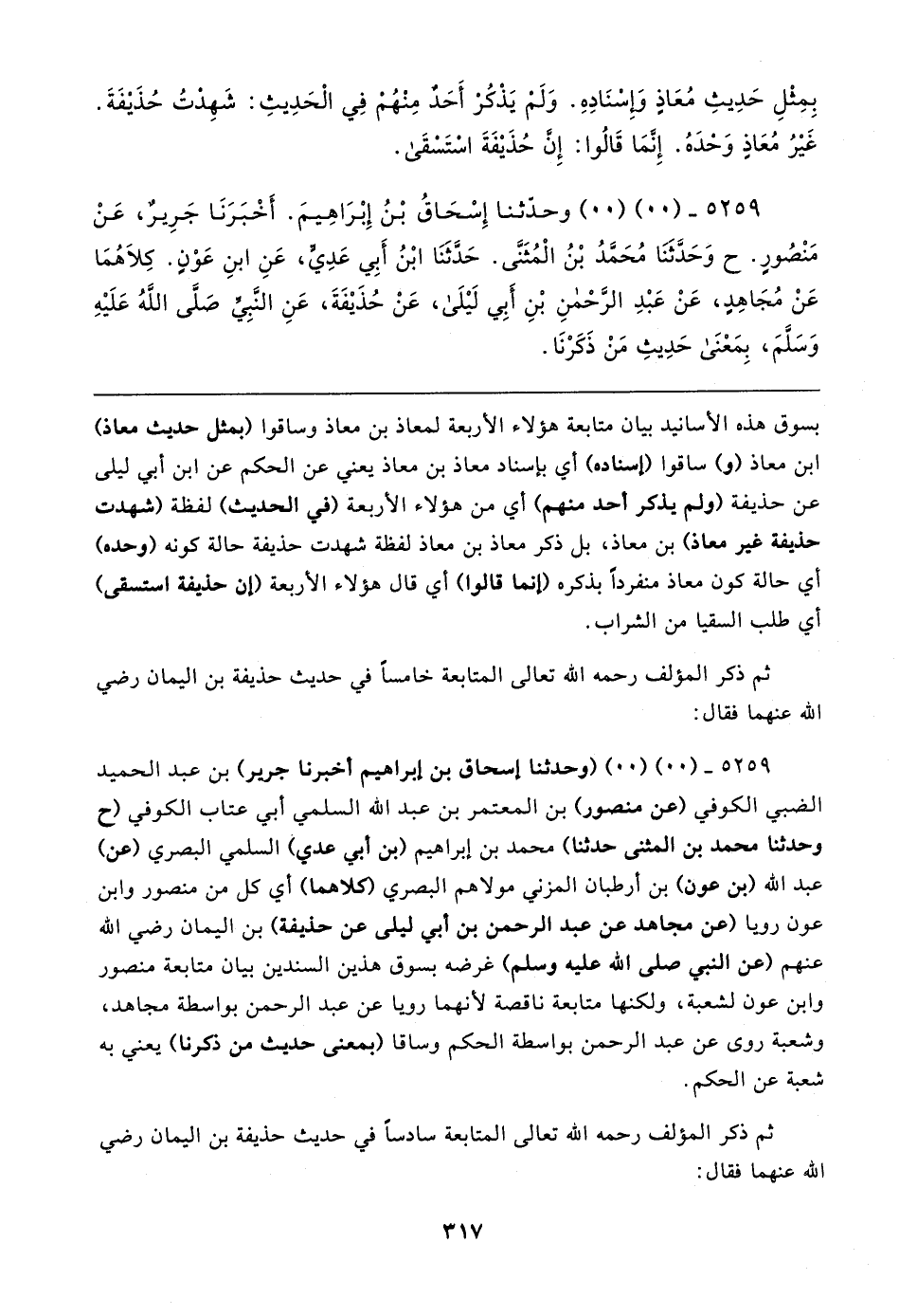 ٥٢٥٩ - (٠٠) (٠٠) وحدّثنا إِسْحَاقُ بْنُ إِبْرَاهِيمَ. أَخْبَرَنَا جَرِيرٌ، عَنْ مَنْصُورٍ. ح وَحَدَّثَنَا مُحَمَّدُ بْنُ الْمُثَنَّى. حَدَّثنَا ابْنُ أَبِي عَدِيٍّ، عَنِ ابنِ عَوْنٍ. كِلاهُمَا عَنْ مُجَاهِدٍ، عَنْ عَبْدِ الرَّحْمنِ بْنِ أَبِي لَيلَى، عَنْ حُذَيفَةَ، عَنِ النَّبِيِّ صَلَّى اللهُ عَلَيهِ وَسَلَّمَ، بِمَعْنَى حَدِيثِ مَنْ ذَكَرْنَا