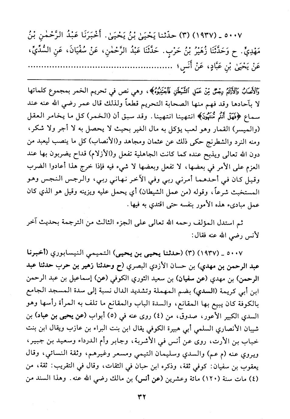 ٥٠٠٧ - (١٩٣٧) (٣) (حدثنا يحيى بن يحيى) التَّمِيمِيّ النَّيسَابُورِيّ (أخبرنا عبد الرَّحْمَن بن مهدي) بن حسان الأَزدِيّ البَصْرِيّ (ح وحدثنا زهير بن حرب حَدَّثَنَا عبد الرَّحْمَن) بن مهدي (عن سفيان) بن سعيد الثَّوريّ الكُوفيّ (عن) إسماعيل بن عبد الرَّحْمَن بن أبي كريمة (السدي) بضم المهملة وتشديد الدال نسبة إلى سدة المسجد الجامع بالكوفة كان يبيع بها المقانع، والسدة الباب والمقانع ما تلف به المرأة رأسها وهو السدي الكبير الأعور، صدوق، من (٤) روى عنه في (٥) أبواب (عن يحيى بن عباد) بن شيبان الأَنْصَارِيّ السلمي أبي هبيرة الكُوفيّ يقال ابن بنت البراء بن عازب ويقال ابن بنت خباب بن الأرت، روى عن أنس في الأشربة، وجابر وأم الدَّرداء وسعيد بن جبير، ويروي عنه (م عم) والسدي وسليمان التَّيميّ ومسعر وغيرهم، وثقة النَّسائيّ، وقال يعقوب بن سفيان: كُوفِيّ ثِقَة، وذكره ابن حبان في الثِّقات، وقال في التقريب: ثِقَة، من (٤) مات سنة (١٢٠) مائة وعشرين (عن أنس) بن مالك رضي الله عنه. وهذا السند من