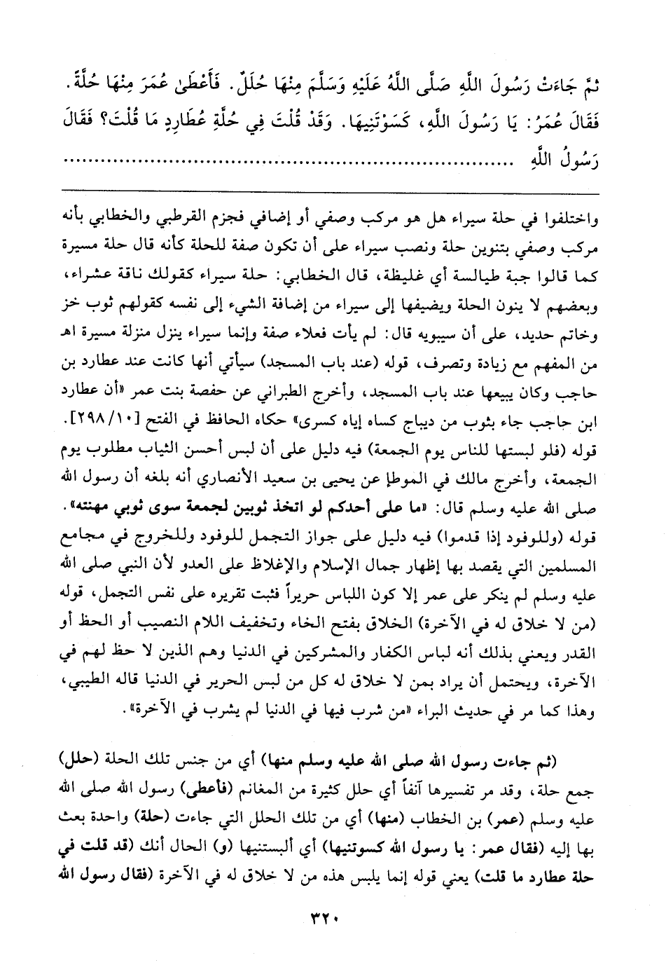 ثمَّ جَاءَتْ رَسُولَ اللهِ - صلى الله عليه وسلم - مِنهَا حُلَلٌ. فَأعْطَى عُمَرَ مِنْهَا حُلَّة. فَقَال عُمَرُ: يَا رَسُولَ اللهِ، كَسَوْتَنِيهَا. وَقَدْ قُلْتَ في حُلَّةِ عُطَارِدٍ مَا قُلْتَ؟ فَقَال رَسُولُ اللهِ