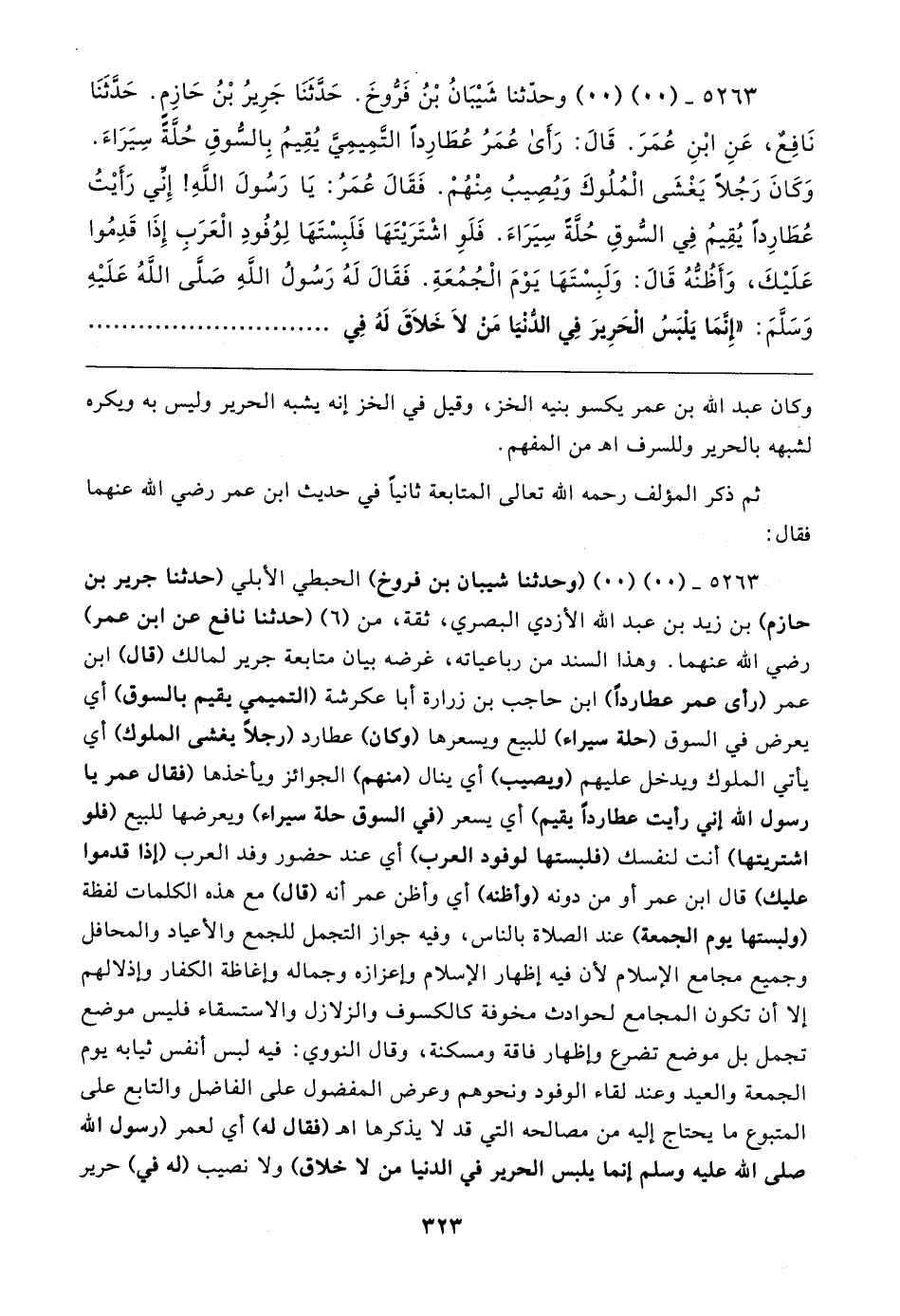 ٥٢٦٣ - (٠٠) (٠٠) وحدّثنا شَيبَانُ بْنُ فَرُّوخَ. حَدَّثَنَا جَرِيرُ بْنُ حَازِمٍ. حَدَّثَنَا نَافِعٌ، عَنِ ابْنِ عُمَرَ. قَال: رَأَى عُمَرُ عُطَارِدًا التَّمِيمِيَّ يُقِيمُ بِالسُّوقِ حُلَّةً سِيَرَاءَ. وَكَانَ رَجُلًا يَغْشَى الْمُلُوكَ وَيُصِيبُ مِنْهُمْ. فَقَال عُمَرُ: يَا رَسُولَ اللهِ! إِنِّي رَأَيتُ عُطَارِدًا يُقِيمُ في السُّوقِ حُلَّةً سِيَرَاءَ. فَلَو اشْتَرَيتَهَا فَلَبِسْتَهَا لِوُفُودِ الْعَرَبِ إِذَا قَدِمُوا عَلَيكَ، وَأَظُنُّهُ قَال: وَلَبِسْتَهَا يَوْمَ الْجُمُعَةِ. فَقَال لَهُ رَسُولُ الله - صلى الله عليه وسلم -: "إِنَّمَا يَلْبَسُ الْحَرِيرَ في الدُّنْيَا مَن لَا خَلاقَ لَهُ في