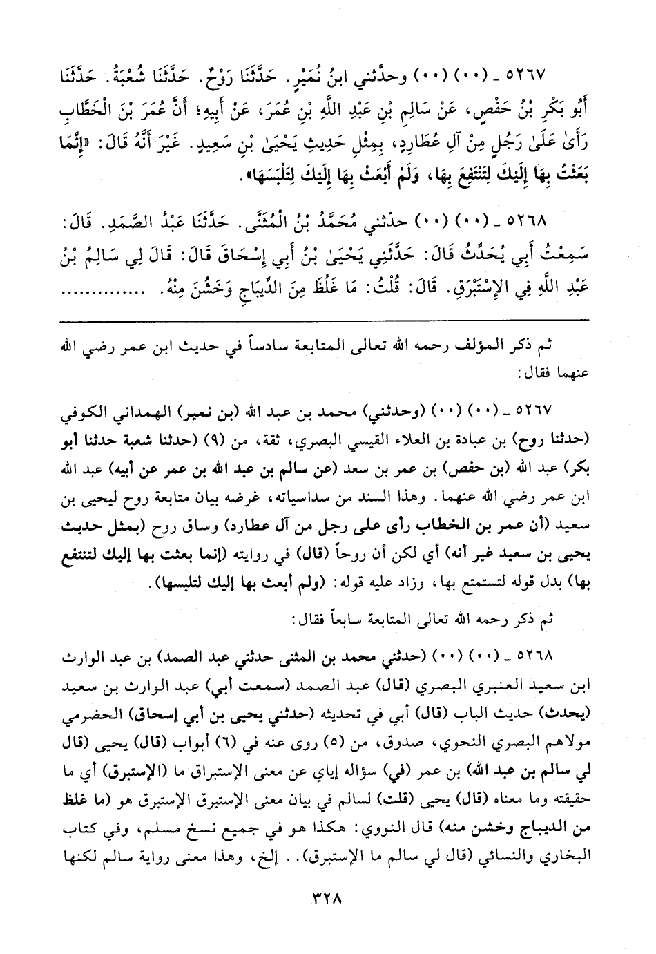 ٥٢٦٧ - (٠٠) (٠٠) (وحدثني) محمد بن عبد الله (بن نمير) الهمداني الكوفي (حدثنا روح) بن عبادة بن العلاء القيسي البصري، ثقة، من (٩) (حدثنا شعبة حدثنا أبو بكر) عبد الله (بن حفص) بن عمر بن سعد (عن سالم بن عبد الله بن عمر عن أبيه) عبد الله بن عمر رضي الله عنهما. وهذا السند من سداسياته، غرضه بيان متابعة روح ليحيى بن سعيد (أن عمر بن الخطاب رأى على رجل من آل عطارد) وساق روح (بمثل حديث يحيى بن سعيد غير أنه) أي لكن أن روحًا (قال) في روايته (إنما بعثت بها إليك لتنتفع بها) بدل قوله لتستمتع بها، وزاد عليه قوله: (ولم أبعث بها إليك لتلبسها).