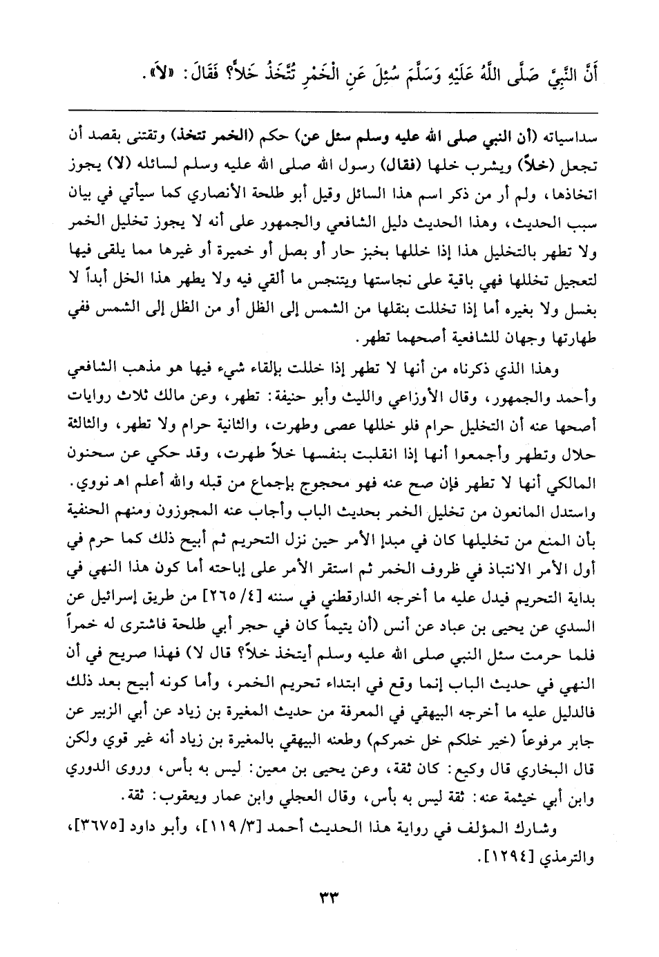 وهذا الذي ذكرناه من أنها لا تطهر إذا خللت بإلقاء شيء فيها هو مذهب الشَّافعيّ وأَحمد والجمهور، وقال الأَوْزَاعِيّ والليث وأبو حنيفة: تطهر، وعن مالك ثلاث روايات أصحها عنه أن التخليل حرام فلو خللها عصى وطهرت، والثانية حرام ولا تطهر، والثالثة حلال وتطهر وأجمعوا أنها إذا انقلبت بنفسها خلًا طهرت، وقد حكي عن سحنون المالكي أنها لا تطهر فإن صح عنه فهو محجوج بإجماع من قبله والله أعلم اهـ نووي. واستدل المانعون من تخليل الخمر بحديث الباب وأجاب عنه المجوزون ومنهم الحنفية بأن المنع من تخليلها كان في مبدإ الأمر حين نزل التحريم ثم أبيح ذلك كما حرم في أول الأمر الانتباذ في ظروف الخمر ثم استقر الأمر على إباحته أما كون هذا النهي في بداية التحريم فيدل عليه ما أخرجه الدارقطني في سننه [٤/ ٢٦٥] من طريق إسرائيل عن السدي عن يحيى بن عباد عن أنس (أن يتيمًا كان في حجر أبي طلحة فاشترى له خمرًا فلما حرمت سئل النَّبِيّ صلى الله عليه وسلم أيتخذ خلًا؟ قال لا) فهذا صريح في أن النهي في حديث الباب إنما وقع في ابتداء تحريم الخمر، وأما كونه أبيح بعد ذلك فالدليل عليه ما أخرجه البيهقي في المعرفة من حديث المغيرة بن زياد عن أبي الزُّبير عن جابر مرفوعًا (خير خلكم خل خمركم) وطعنه البيهقي بالمغيرة بن زياد أنَّه غير قوي ولكن قال البُخَارِيّ قال وكيع: كان ثِقَة، وعن يحيى بن معين: ليس به بأس، وروى الدُّوريّ وابن أبي خيثمة عنه: ثِقَة ليس به بأس، وقال العجلي وابن عمار ويعقوب: ثِقَة.