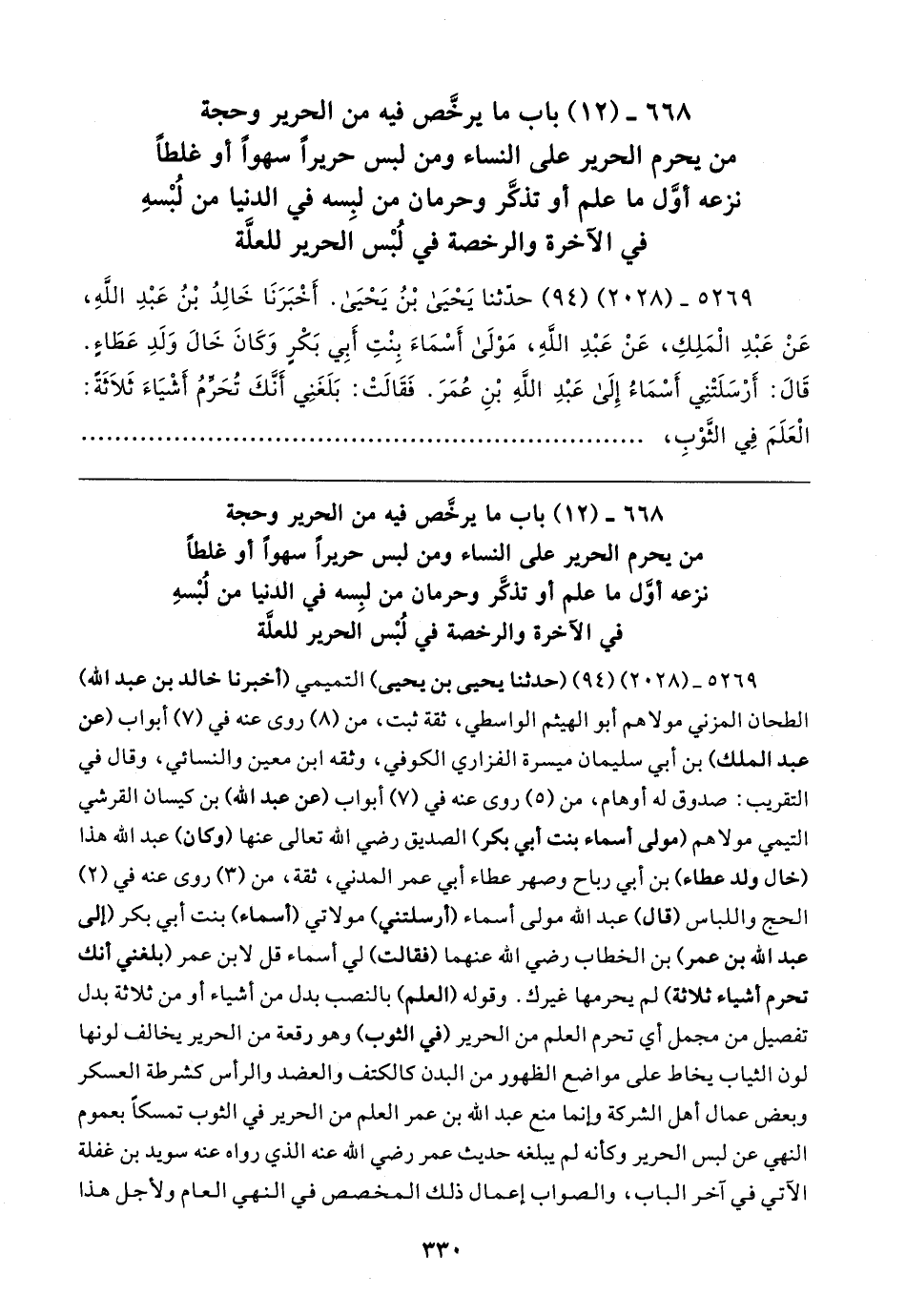 ٦٦٨ - (١٢) باب ما يرخَّص فيه من الحرير وحجة من يحرم الحرير على النساء ومن لبس حريرًا سهوًا أو غلطًا نزعه أوَّل ما علم أو تذكَّر وحرمان من لبِسه في الدنيا من لُبْسهِ في الآخرة والرخصة في لُبْس الحرير للعلَّة