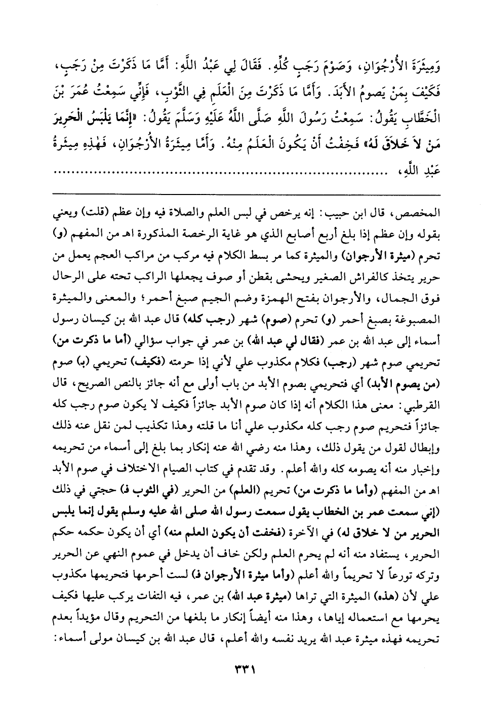 المخصص، قال ابن حبيب: إنه يرخص في لبس العلم والصلاة فيه وإن عظم (قلت) ويعني بقوله وإن عظم إذا بلغ أربع أصابع الذي هو غاية الرخصة المذكورة اهـ من المفهم (و) تحرم (ميثرة الأرجوان) والميثرة كما مر بسط الكلام فيه مركب من مراكب العجم يعمل من حرير يتخذ كالفراش الصغير ويحشى بقطن أو صوف يجعلها الراكب تحته على الرحال فوق الجمال، والأرجوان بفتح الهمزة وضم الجيم صبغ أحمر؛ والمعنى والميثرة المصبوغة بصبغ أحمر (و) تحرم (صوم) شهر (رجب كله) قال عبد الله بن كيسان رسول أسماء إلى عبد الله بن عمر (فقال لي عبد الله) بن عمر في جواب سؤالي (أما ما ذكرت من) تحريمي صوم شهر (رجب) فكلام مكذوب علي لأني إذا حرمته (فكيف) تحريمي (بـ) صوم (من يصوم الأبد) أي فتحريمي بصوم الأبد من باب أولى مع أنه جائز بالنص الصريح، قال القرطبي: معنى هذا الكلام أنه إذا كان صوم الأبد جائزًا فكيف لا يكون صوم رجب كله جائزًا فتحريم صوم رجب كله مكذوب علي أنا ما قلته وهذا تكذيب لمن نقل عنه ذلك وإبطال لقول من يقول ذلك، وهذا منه رضي الله عنه إنكار بما بلغ إلى أسماء من تحريمه وإخبار منه أنه يصومه كله والله أعلم. وقد تقدم في كتاب الصيام الاختلاف في صوم الأبد اهـ من المفهم (وأما ما ذكرت من) تحريم (العلم) من الحرير (في الثوب فـ) حجتي في ذلك (إني سمعت عمر بن الخطاب يقول سمعت رسول الله صلى الله عليه وسلم يقول إنما يلبس الحرير من لا خلاق له) في الآخرة (فخفت أن يكون العلم منه) أي أن يكون حكمه حكم الحرير، يستفاد منه أنه لم يحرم العلم ولكن خاف أن يدخل في عموم النهي عن الحرير وتركه تورعًا لا تحريمًا والله أعلم (وأما ميثرة الأرجوان فـ) لست أحرمها فتحريمها مكذوب علي لأن (هذه) الميثرة التي تراها (ميثرة عبد الله) بن عمر، فيه التفات يركب عليها فكيف يحرمها مع استعماله إياها، وهذا منه أيضًا إنكار ما بلغها من التحريم وقال مؤيدًا بعدم تحريمه فهذه ميثرة عبد الله يريد نفسه والله أعلم، قال عبد الله بن كيسان مولى أسماء: