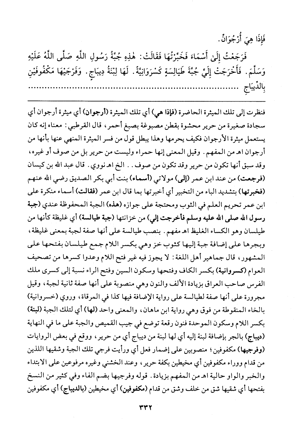 فَرَجَعْتُ إِلَى أَسْمَاءَ فَخَبَّرْتُهَا فَقَالتْ: هذِهِ جُبَّةُ رَسُولِ الله - صلى الله عليه وسلم -. فَأخْرَجَتْ إِليَّ جُبَّةَ طَيَالِسَةٍ كَسْرَوَانِيَّةَ. لَهَا لِبْنَةُ دِيبَاجٍ. وَفَرْجَيهَا مَكْفُوفَينِ بِالدِّيبَاجِ