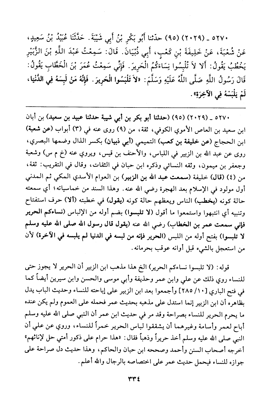 ٥٢٧٠ - (٢٠٢٩) (٩٥) حدَّثنا أَبُو بَكْرِ بْنُ أَبِي شَيبَةَ. حَدَّثَنَا عُبَيدُ بْنُ سَعِيدٍ، عَنْ شُعْبَةَ، عَنْ خَلِيفَةَ بْنِ كَعْبٍ، أَبِي ذُبْيَانَ. قَال: سَمِعْتُ عَبْدَ اللَّهِ بْنَ الزُّبَيْرِ يَخْطُبُ يَقُولُ: أَلا لَا تُلْبِسُوا نِسَاءَكُمُ الْحَرِيرَ. فَإِني سَمِعْتُ عُمَرَ بْنَ الْخَطَّابِ يَقُولُ: قَال رَسُولُ اللهِ - صلى الله عليه وسلم -: "لَا تَلبَسُوا الْحَرِيرَ. فَإنَّهُ مَنْ لَبِسَهُ في الدُّنْيَا، لَمْ يَلْبَسْهُ في الآخِرَةِ"