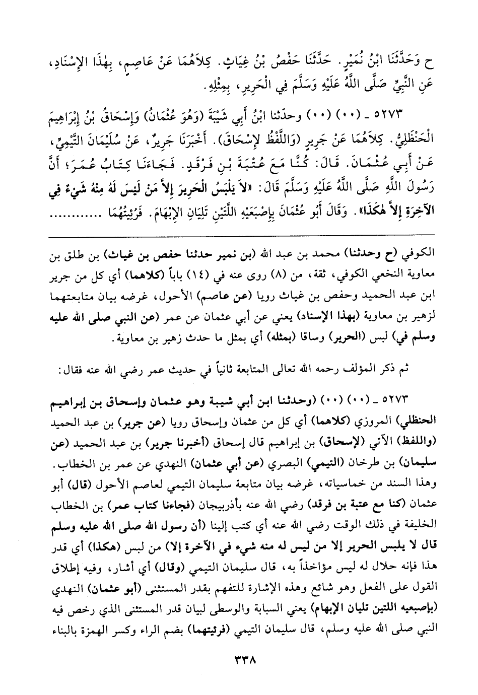 ٥٢٧٣ - (٠٠) (٠٠) وحدَّثنا ابْنُ أَبِي شَيبَةَ (وَهُوَ عُثْمَانُ) وَإِسْحَاقُ بْنُ إِبْرَاهِيمَ الْحَنْظَلِيُّ. كِلاهُمَا عَنْ جَرِيرٍ (وَاللَّفْظُ لإِسْحَاقَ). أَخْبَرَنَا جَرِيرٌ، عَنْ سُلَيمَانَ التَّيمِيِّ، عَنْ أَبِي عُثْمَانَ. قَال: كُنَّا مَعَ عُتْبَةَ بْنِ فَرْقَدٍ. فَجَاءَنَا كِتَابُ عُمَرَ؛ أَنَّ رَسُولَ الله - صلى الله عليه وسلم - قَال: "لَا يَلْبَسُ الحَرِيرَ إلا مَنْ لَيسَ لَهُ مِنْهُ شَيءٌ في الآخِرَةِ إلا هكَذَا". وَقَال أَبُو عُثْمَانَ بِإِصْبَعَيهِ اللَّتَينِ تَلِيَانِ الإِبْهَامَ. فَرُئِيتُهُمَا