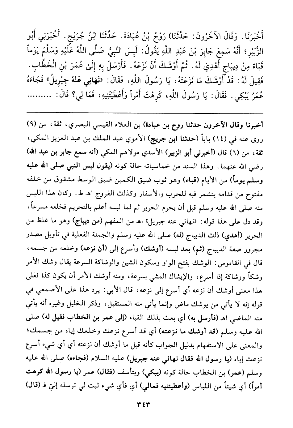 أَخْبَرَنَا. وَقَال الآخَرُونَ: حَدَّثَنَا) رَوْحُ بْنُ عُبَادَةَ. حَدَّثَنَا ابْنُ جُرَيجٍ. أَخْبَرَنِي أَبُو الزُّبَيرِ؛ أَنَّهُ سَمِعَ جَابِرَ بْنَ عَبْدِ اللهِ يَقُولُ: لَبِسَ النَّبِيُّ - صلى الله عليه وسلم - يَوْمًا قَبَاءً مِنْ دِيبَاجِ أُهْدِيَ لَهُ. ثُمَّ أَوْشَكَ أَنْ نَزَعَهُ. فَأَرْسَلَ بِهِ إِلَى عُمَرَ بْنِ الْخَطابِ. فَقِيلَ لَهُ: قَدْ أَوْشَكَ مَا نَزَعْتَهُ، يَا رَسُولَ اللهِ، فَقَال: "نَهَانِي عَنْهُ جِبْرِيلُ" فَجَاءَهُ عُمَرُ يَبْكِي. فَقَال: يَا رَسُولَ اللهِ، كَرِهْتَ أَمْرًا وَأَعْطَيتَنِيهِ، فَمَا لِي؟ قَال: