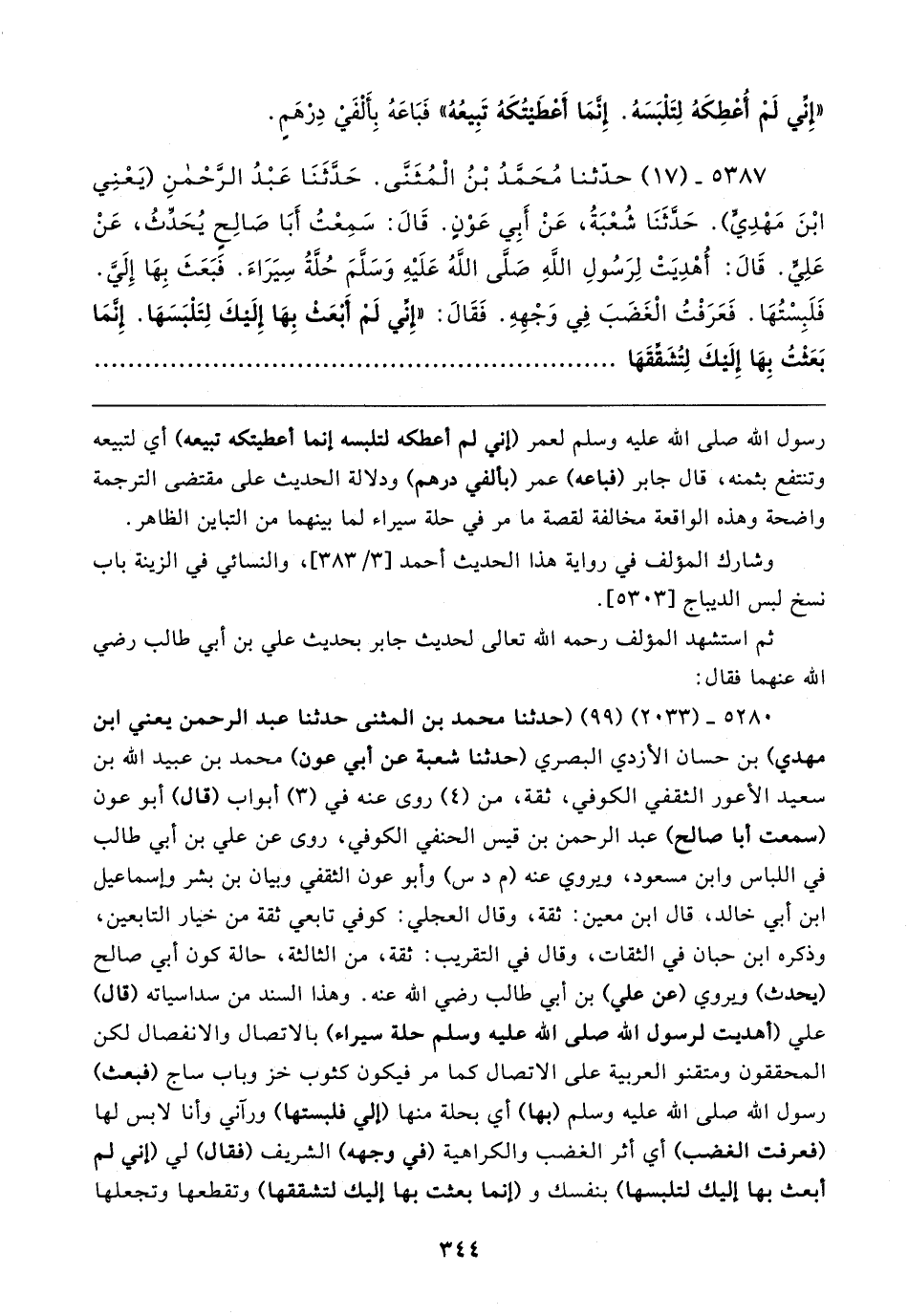 ٥٣٨٧ - (١٧) حدَّثنا مُحَمَّدُ بْنُ الْمُثَنَّى. حَدَّثَنَا عَبْدُ الرَّحْمنِ (يَعْنِي ابْنَ مَهْدِيّ). حَدُّثَنَا شُعْبَةُ، عَنْ أَبِي عَوْنٍ. قَال: سَمِعْتُ أَبَا صَالِحِ يُحَدِّثُ، عَنْ عَلِيٍّ. قَال: أُهْدِيَتْ لِرَسُولِ اللَّهِ صَلَّى اللَّهُ عَلَيهِ وَسَلَّمَ حُلَّةُ سِيَرَاءَ. فَبَعَثَ بِهَا إِلَيَّ. فَلَبِسْتُهَا. فَعَرَفْتُ الْغَضَبَ في وَجْهِهِ. فَقَال: "إِنِّي لَمْ أَبْعَثْ بِهَا إِلَيكَ لِتَلْبَسَهَا. إِنَّمَا بَعَثْتُ بِهَا إِلَيكَ لِتُشَقِّقَهَا
