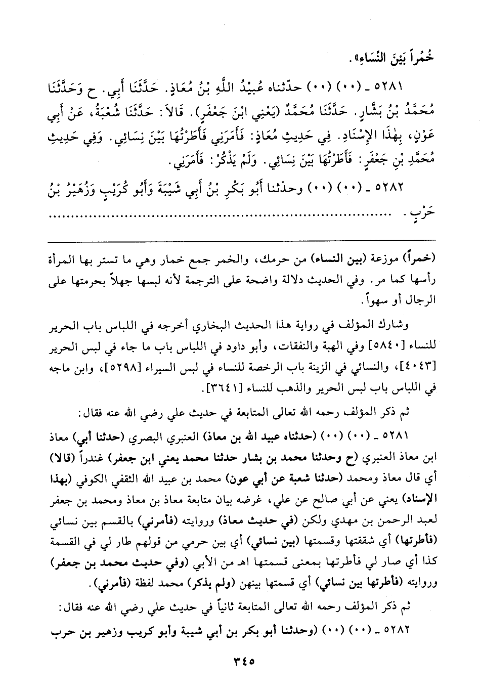 ٥٢٨١ - (٠٠) (٠٠) (حدثناه عبيد الله بن معاذ) العنبري البصري (حدثنا أبي) معاذ بن معاذ العنبري (ح وحدثنا محمد بن بشار حدثنا محمد يعني ابن جعفر) غندرًا (قالا) أي قال معاذ ومحمد (حدثنا شعبة عن أبي عون) محمد بن عبيد الله الثقفي الكوفي (بهذا الإسناد) يعني عن أبي صالح عن علي، غرضه بيان متابعة معاذ بن معاذ ومحمد بن جعفر لعبد الرحمن بن مهدي ولكن (في حديث معاذ) وروايته (فأمرني) بالقسم بين نسائي (فأطرتها) أي شققتها وقسمتها (بين نسائي) أي بين حرمي من قولهم طار لي في القسمة كذا أي صار لي فأطرتها بمعنى قسمتها اهـ من الأبي (وفي حديث محمد بن جعفر) وروايته (فأطرتها بين نسائي) أي قسمتها بينهن (ولم يذكر) محمد لفظة (فأمرني).