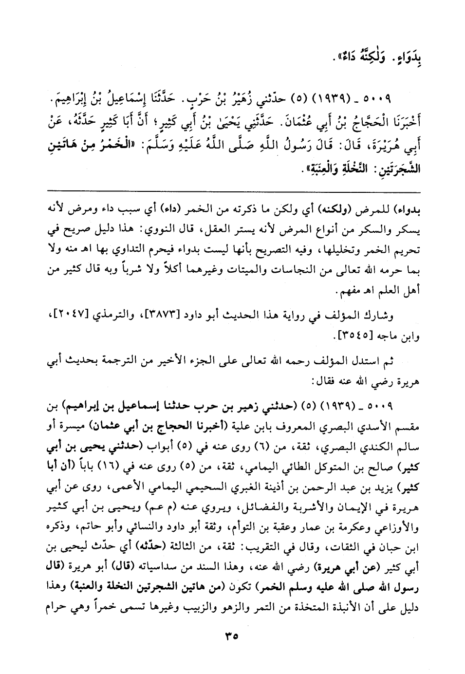 ٥٠٠٩ - (١٩٣٩) (٥) حدثني زُهَيرُ بْنُ حَرْبٍ. حَدَّثَنَا إِسْمَاعِيلُ بْنُ إِبْرَاهِيمَ. أَخْبَرَنَا الحجاج بْنُ أَبِي عُثْمَانَ. حَدَّثَنِي يَحْيَى بْنُ أَبِي كَثِيرٍ؛ أَنَّ أَبَا كَثِيرٍ حَدّثَهُ، عَنْ أَبِي هُرَيرَةَ، قَال: قَال رَسُولُ اللهِ صَلى اللهُ عَلَيهِ وسلَّمَ: "الخَمْرُ من هَاتَينِ الشجَرَتَينِ: النخْلَةِ وَالعِنَبَةِ"