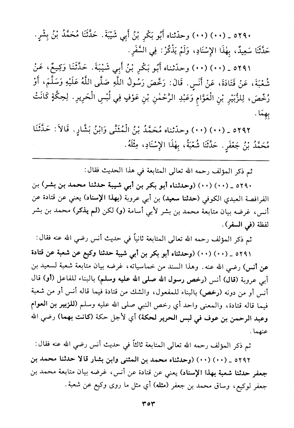 ٥٢٩١ - (٠٠) (٠٠) وحدَّثناه أَبُو بَكْرِ بْنُ أَبِي شَيبَةَ. حَدَّثَنَا وَكِيعٌ، عَنْ شُعْبَةَ، عَنْ قَتَادَةَ، عَنْ أَنَسٍ. قَال: رَخَّصَ رَسُولُ اللهِ صَلَّى اللَّهُ عَلَيهِ وَسَلمَ، أَوْ رُخِّصَ، لِلزبَيرِ بْنِ الْعَوَّامِ وَعَبْدِ الرَّحْمنِ بْنِ عَوْفٍ في لُبْسِ الْحَرِيرِ. لِحِكَّةٍ كَانَتْ بِهِمَا.