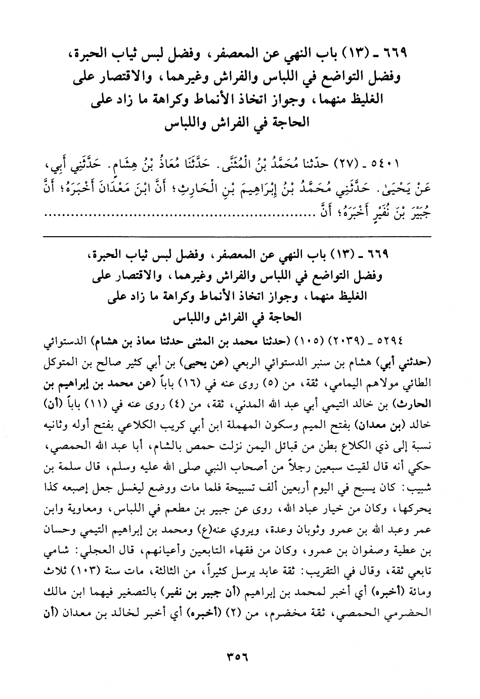 ٦٦٩ - (١٣) باب النهي عن المعصفر، وفضل لبس ثياب الحبرة، وفضل التواضع في اللباس والفراش وغيرهما، والاقتصار على الغليظ منهما، وجواز اتخاذ الأنماط وكراهة ما زاد على الحاجة في الفراش واللباس