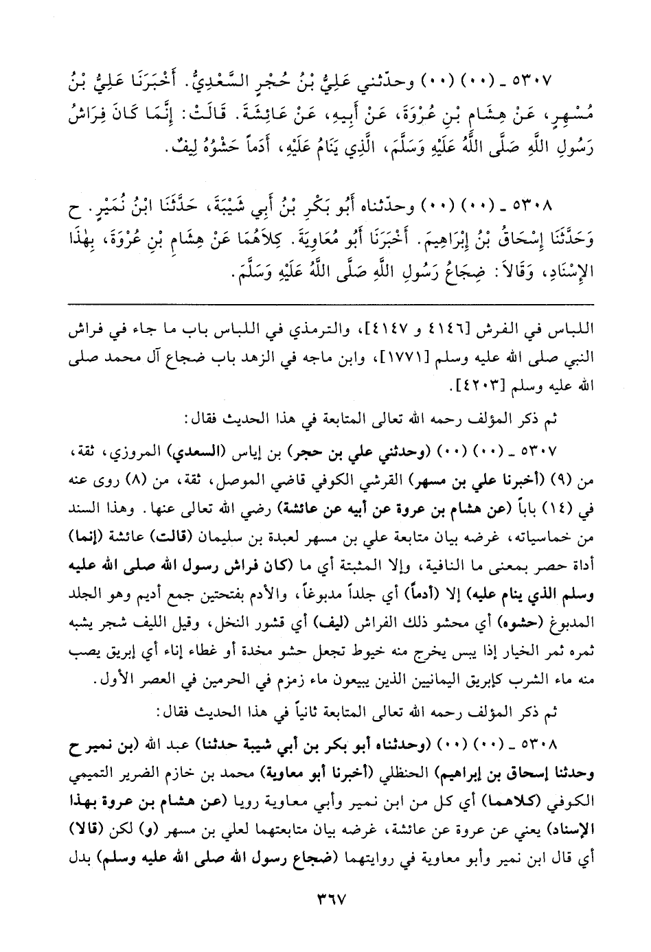 ٥٣٠٧ - (٠٠) (٠٠) (وحدثني علي بن حجر) بن إياس (السعدي) المروزي، ثقة، من (٩) (أخبرنا علي بن مسهر) القرشي الكوفي قاضي الموصل، ثقة، من (٨) روى عنه في (١٤) بابا (عن هشام بن عروة عن أبيه عن عائشة) رضي الله تعالى عنها. وهذا السند من خماسياته، غرضه بيان متابعة علي بن مسهر لعبدة بن سليمان (قالت) عائشة (إنما) أداة حصر بمعنى ما النافية، وإلا المثبتة أي ما (كان فراش رسول الله صلى الله عليه وسلم الذي ينام عليه) إلا (أدمًا) أي جلدًا مدبوغًا، والأدم بفتحتين جمع أديم وهو الجلد المدبوغ (حشوه) أي محشو ذلك الفراش (ليف) أي قشور النخل، وقيل الليف شجر يشبه ثمره ثمر الخيار إذا يبس يخرج منه خيوط تجعل حشو مخدة أو غطاء إناء أي إبريق يصب منه ماء الشرب كإبريق اليمانيين الذين يبيعون ماء زمزم في الحرمين في العصر الأول.