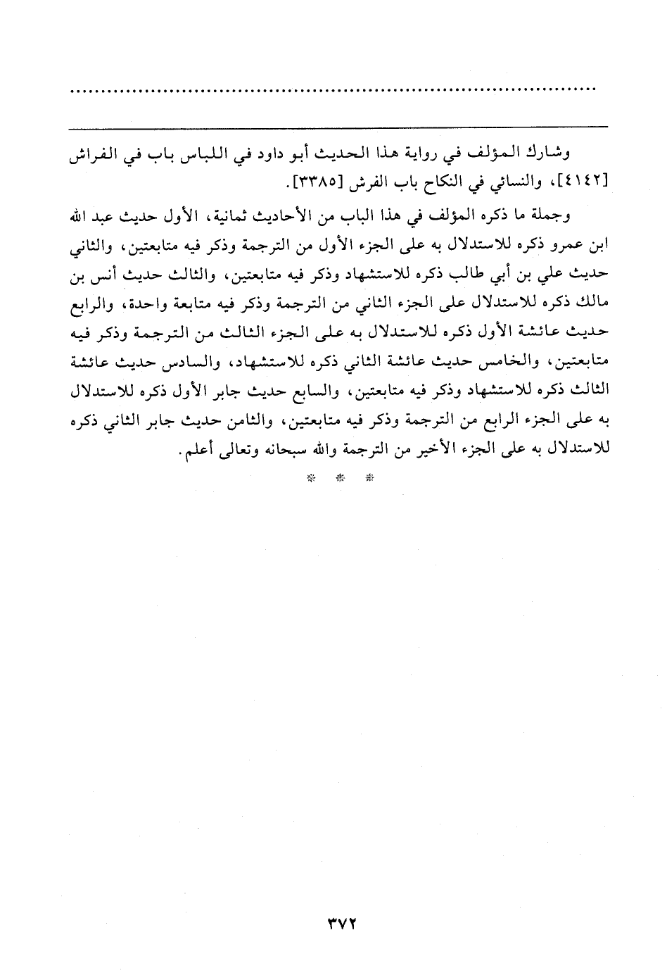 وجملة ما ذكره المؤلف في هذا الباب من الأحاديث ثمانية، الأول حديث عبد الله بن عمرو ذكره للاستدلال به على الجزء الأول من الترجمة وذكر فيه متابعتين، والثاني حديث علي بن أبي طالب ذكره للاستشهاد وذكر فيه متابعتين، والثالث حديث أنس بن مالك ذكره للاستدلال على الجزء الثاني من الترجمة وذكر فيه متابعة واحدة، والرابع حديث عائشة الأول ذكره للاستدلال به على الجزء الثالث من الترجمة وذكر فيه متابعتين، والخامس حديث عائشة الثاني ذكره للاستشهاد، والسادس حديث عائشة الثالث ذكره للاستشهاد وذكر فيه متابعتين، والسابع حديث جابر الأول ذكره للاستدلال به على الجزء الرابع من الترجمة وذكر فيه متابعتين، والثامن حديث جابر الثاني ذكره للاستدلال به على الجزء الأخير من الترجمة والله سبحانه وتعالى أعلم.