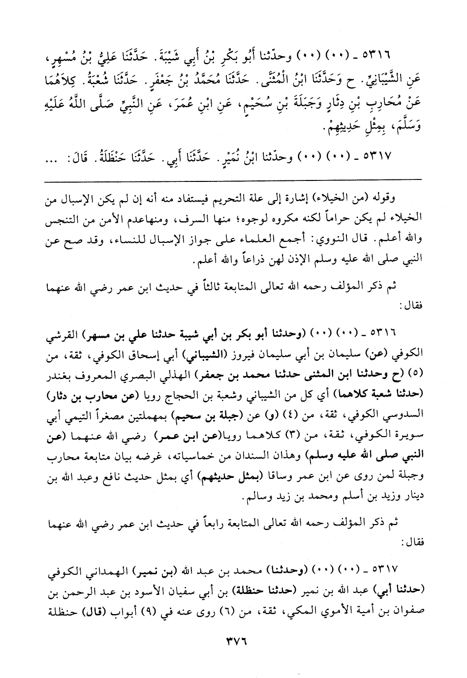 ٥٣١٦ - (٠٠) (٠٠) (وحدثنا أبو بكر بن أبي شيبة حدثنا علي بن مسهر) القرشي الكوفي (عن) سليمان بن أبي سليمان فيروز (الشيباني) أبي إسحاق الكوفي، ثقة، من (٥) (ح وحدثنا ابن المثنى حدثنا محمد بن جعفر) الهذلي البصري المعروف بغندر (حدثنا شعبة كلاهما) أي كل من الشيباني وشعبة بن الحجاج رويا (عن محارب بن دثار) السدوسي الكوفي، ثقة، من (٤) (و) عن (جبلة بن سحيم) بمهملتين مصغرًا التيمي أبي سويرة الكوفي، ثقة، من (٣) كلاهما رويا (عن ابن عمر) رضي الله عنهما (عن النبي صلى الله عليه وسلم) وهذان السندان من خماسياته، غرضه بيان متابعة محارب وجبلة لمن روى عن ابن عمر وساقا (بمثل حديثهم) أي بمثل حديث نافع وعبد الله بن دينار وزيد بن أسلم ومحمد بن زيد وسالم.
